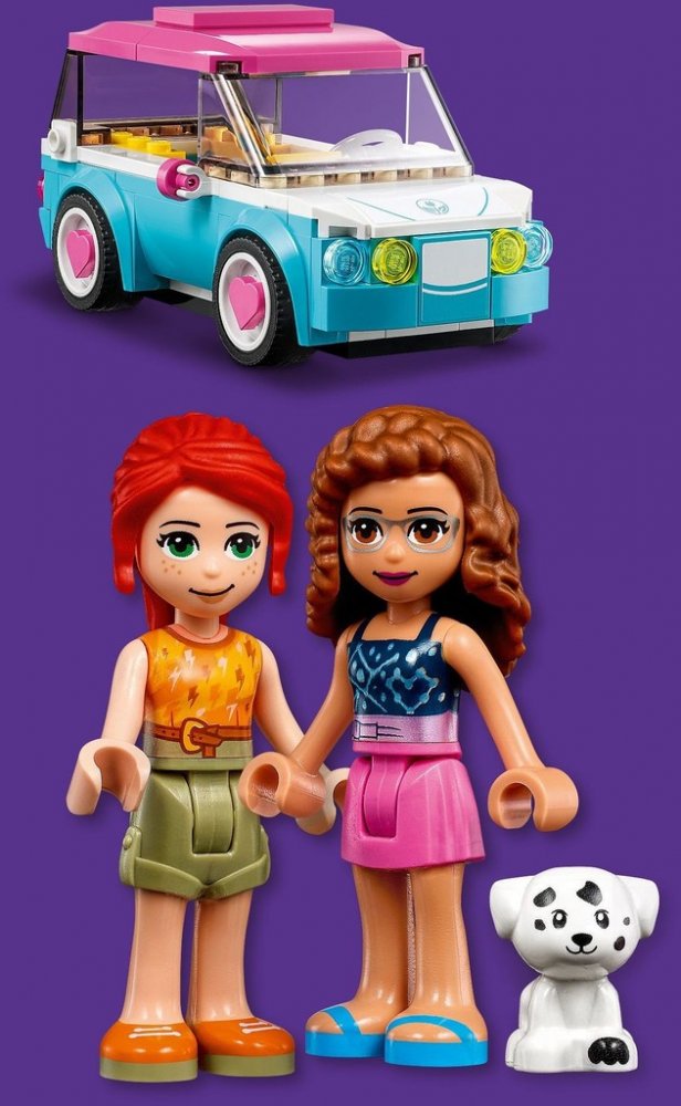 Do barevného elektrického auta se vejdou 2 minipanenky – Mia a Olivia – a na zadním sedadle je místo pro štěňátko Elliota. Součástí sady je nabíjecí stanice, která prostřednictvím větrné turbíny a solárního panelu navazuje na ekologický motiv. Děti se tak mohou znovu rozjet s nulovými emisemi!
