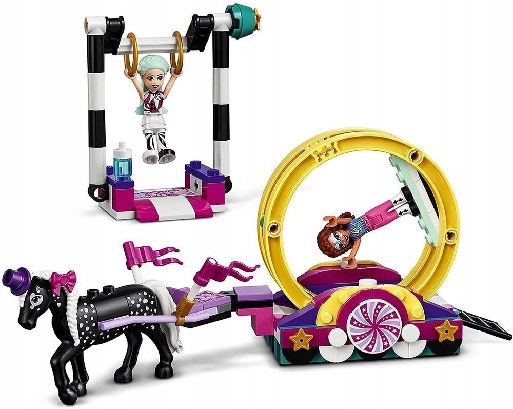 Tato zábavná sada s karnevalovými motivy zamotá malým akrobatům a akrobatkám hlavu radostí. Obsahuje koněm tažený vůz s odnímatelným otočným akrobatickým kolem. Protagonistky přehlídky mohou předvádět parádní kousky také na hrazdě s kruhy. Celé vystoupení pak lze zakončit chůzí minipanenek na chůdách. Stavebnice přináší spoustu kreativních prvků, mezi kterými nechybí pěkné vlaječky a klobouk pro klisnu. Obě figurky mají pomalované tváře a jsou oblečené v nápaditých kostýmech. Dílky, které svítí ve tmě, pak dodají modelu kouzelnou, lehce tajemnou atmosféru.