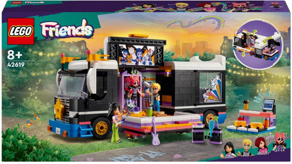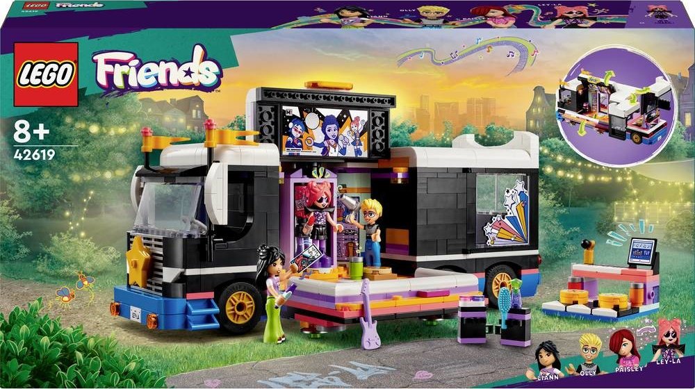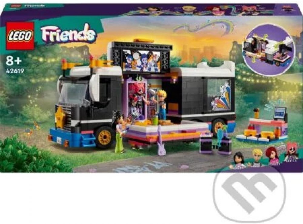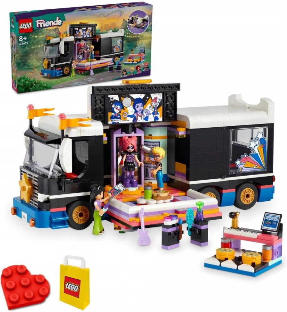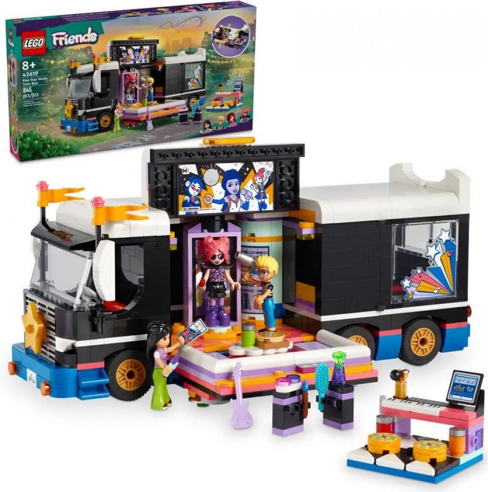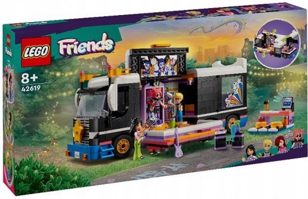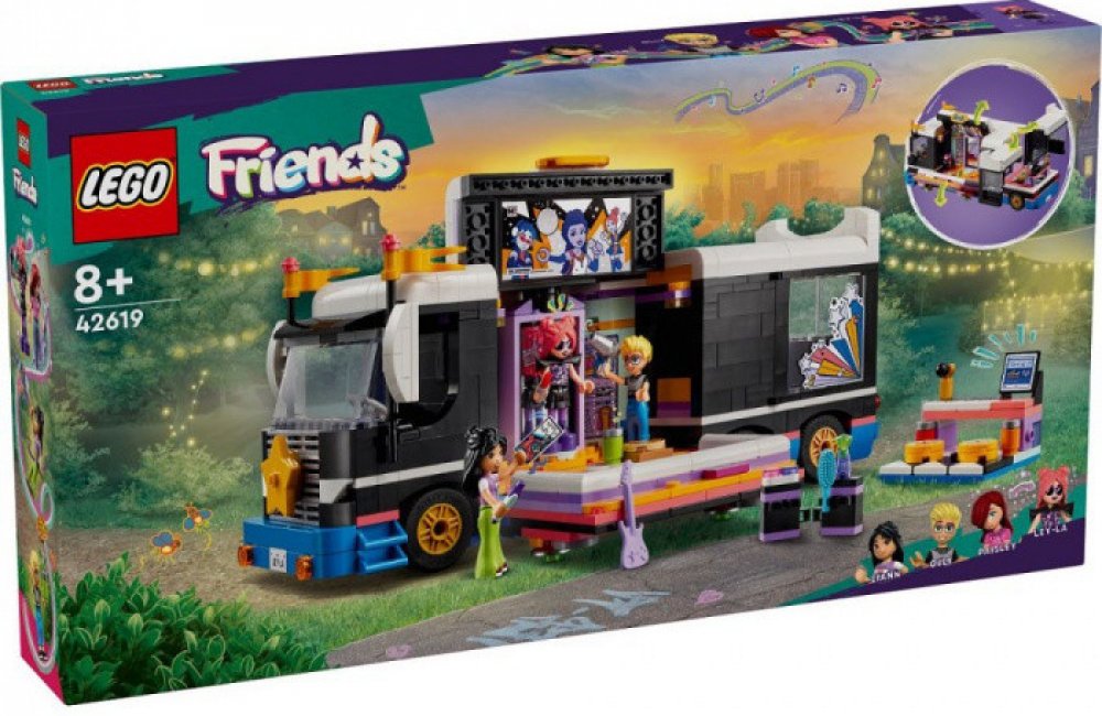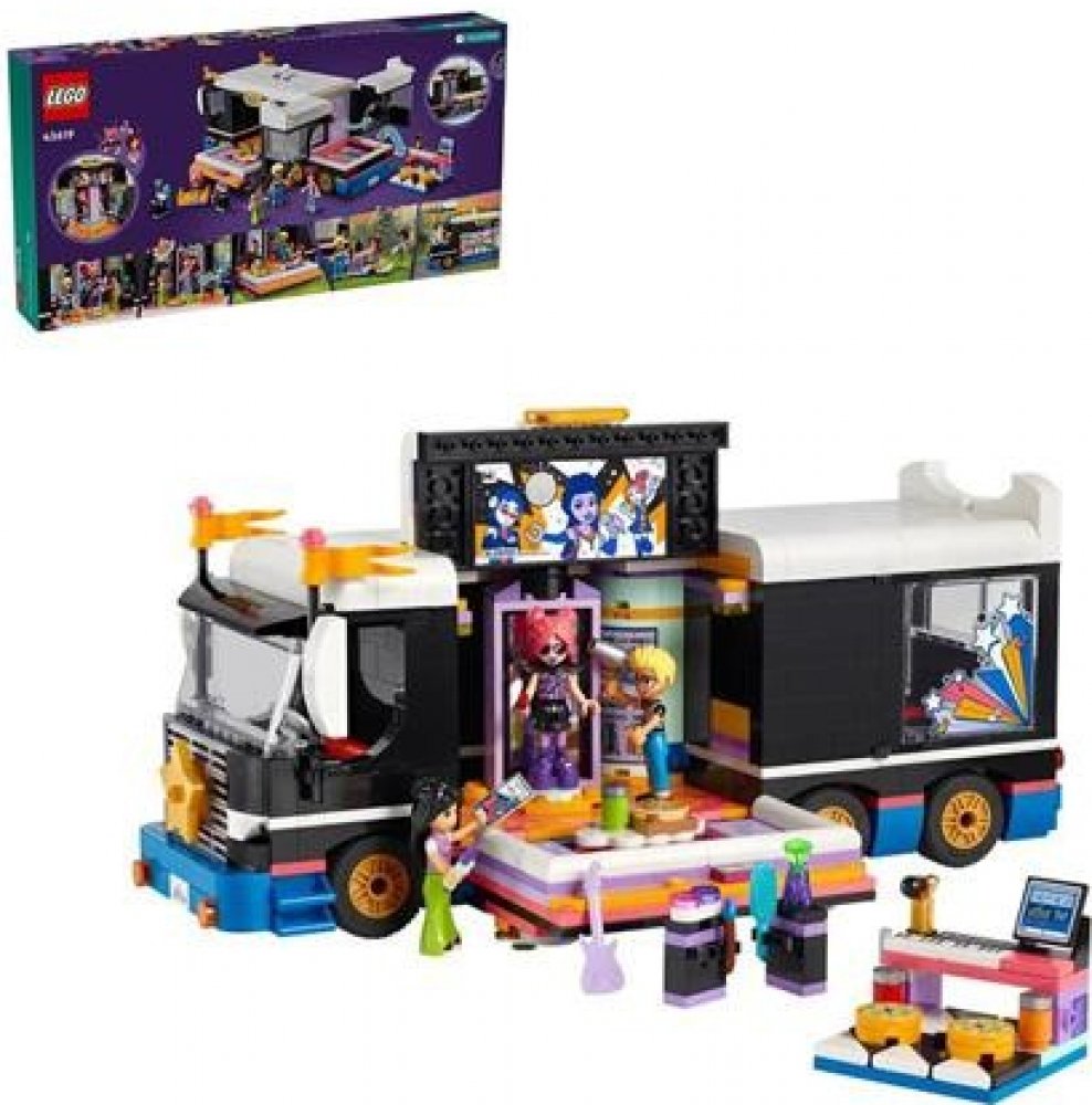Vdechněte život stavebnici LEGO® Friends (42619) Autobus pro turné popových hvězd pro děti od 8 let. Součástí stavebnice je sestavitelný model autobusu a zákulisí s doplňky a 4 postavami LEGO Friends.