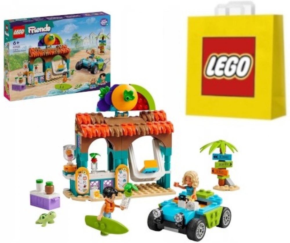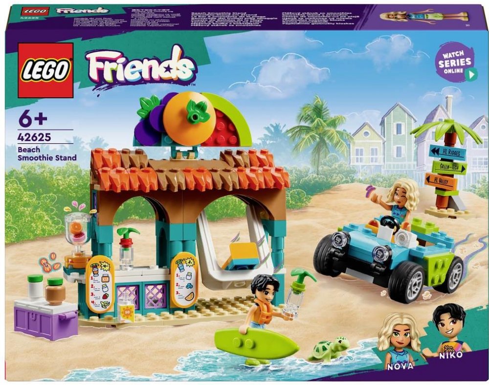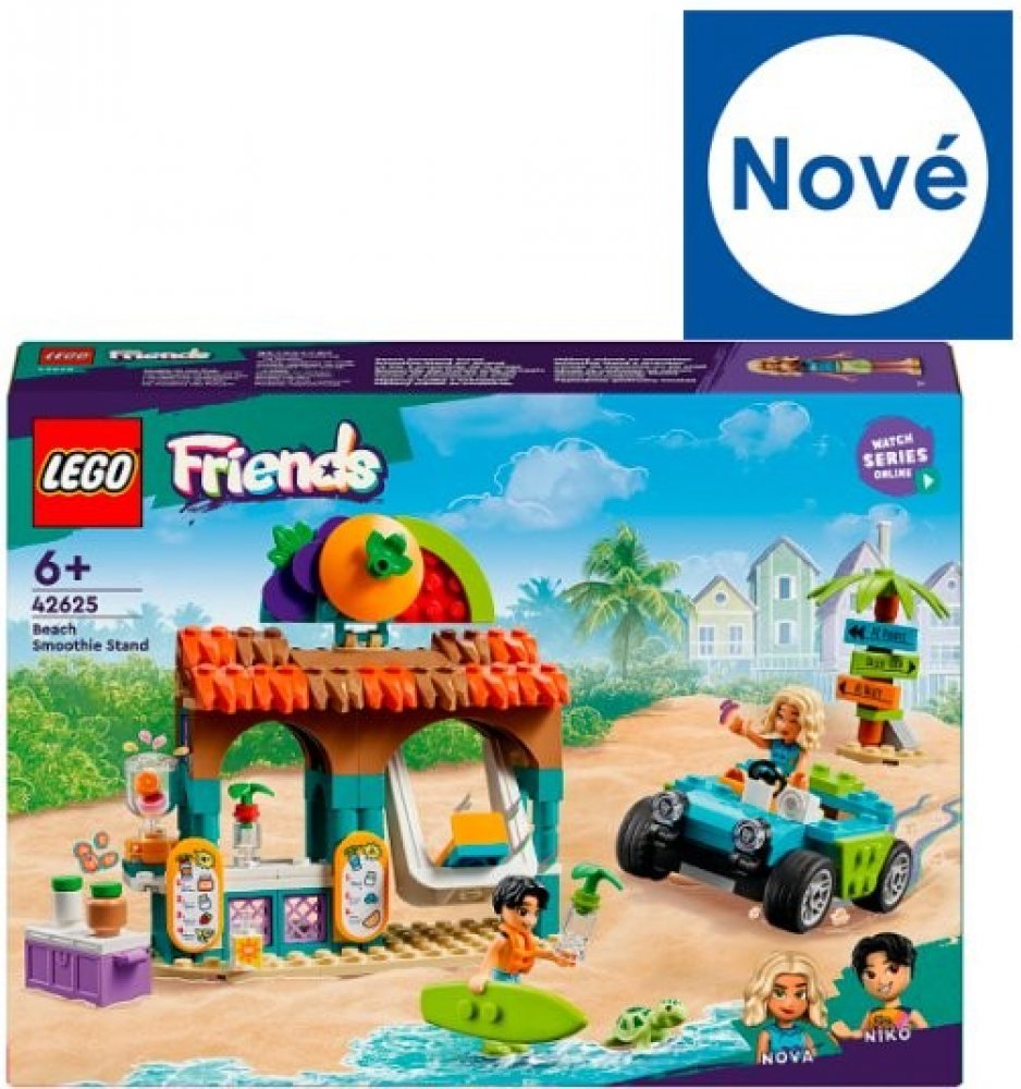 Součástí stavebnice je model stánku se smoothies, plážová bugina a minipanenky LEGO Friends Nova a Niko.