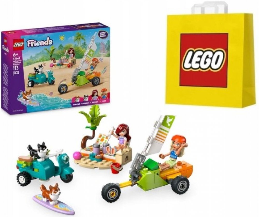 Vydejte se surfovat s touto stavebnicí pro holky, kluky a malé milovníky zvířat od 6 let. Inspirujte děti k vymýšlení vlastních dobrodružství na pláži se stavebnicí Dobrodružství se surfujícími psy a skútrem. Tato hračka obsahuje miniaturní surfovací prkno, skútr, pozemní jachtu a lehátka. Součástí jsou také 2 minipanenky LEGO Friends a 2 figurky pejsků corgi pro kreativní hraní. Stavebnice představuje skvělý dárek pro děti, které milují tvoření. Připojte se k Sage a Paisley, které se vydávají na pláž, kde si budou hrát se svými pejsky corgi. Kamarádky si odpočinou na lehátkách, zatímco pejsci se vystřídají v surfování. Pak si užijí jízdu na skútru nebo v pozemní jachtě, ve kterých je místo i pro pejska!