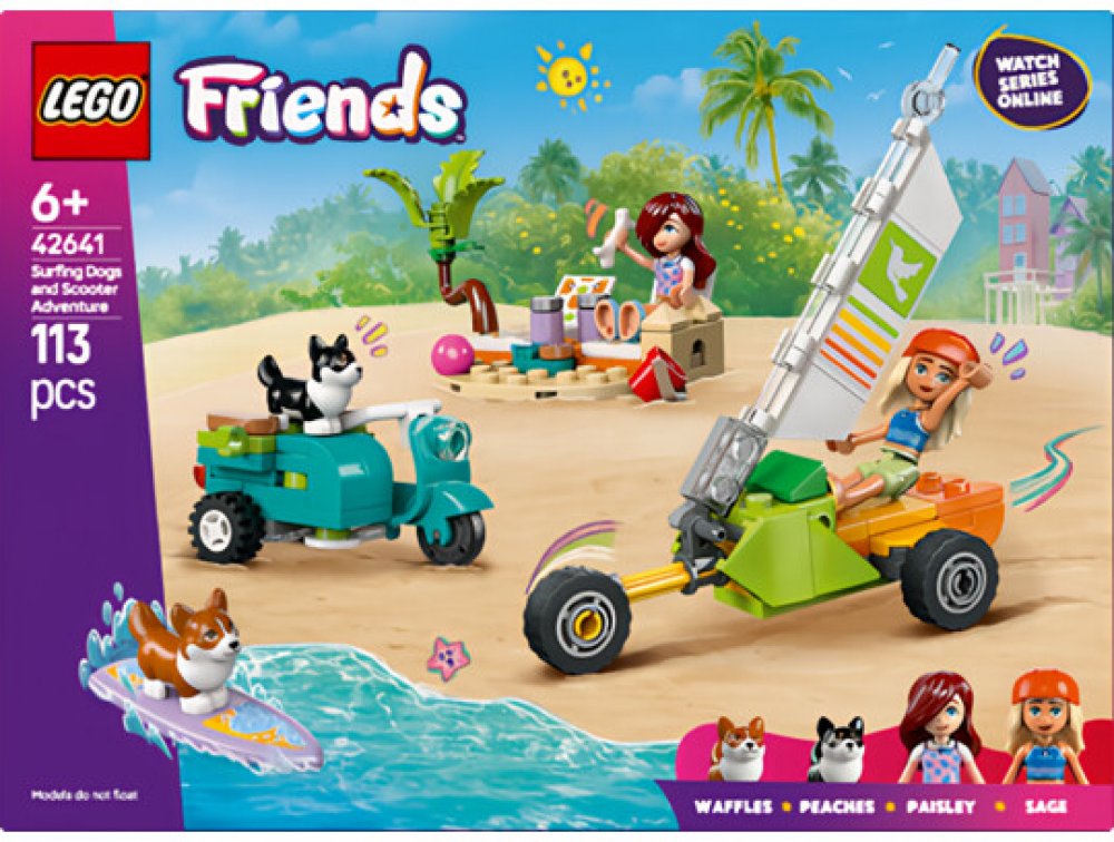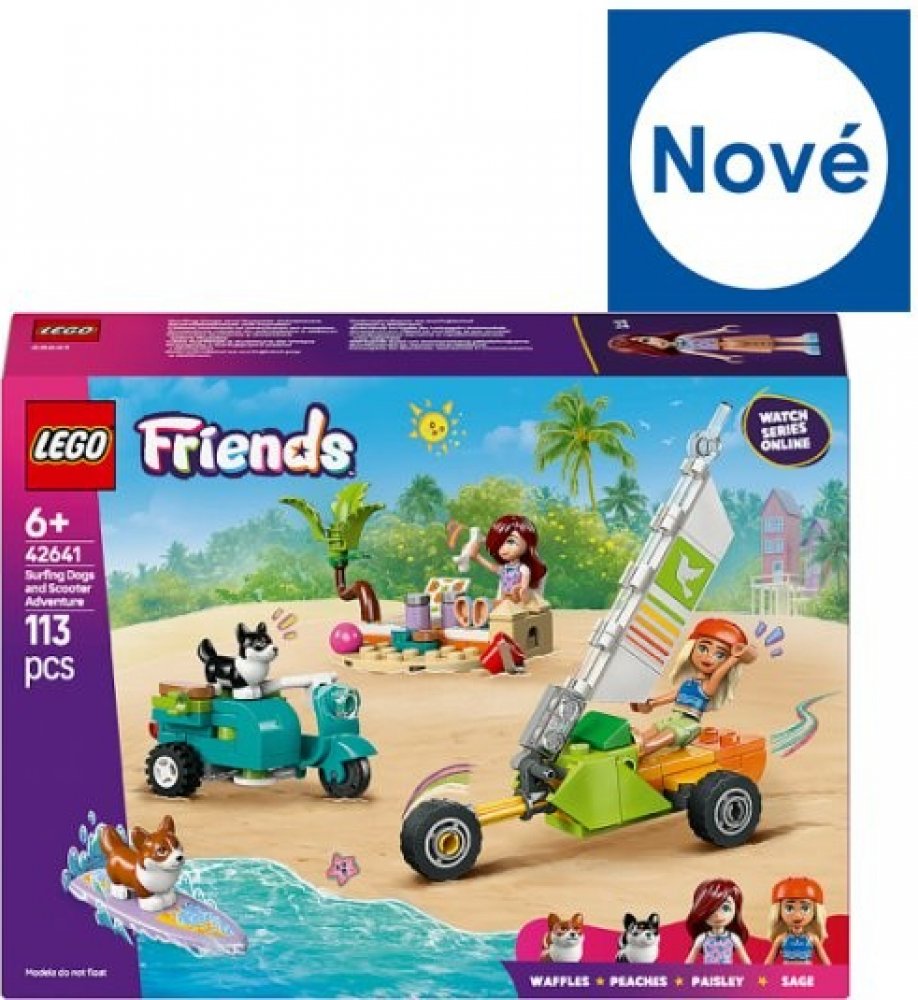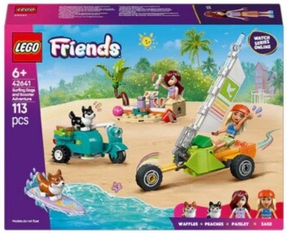 LEGO 42641 - Dobrodružství se surfujícími psy a skútrem z produktové řady LEGO FRIENDS - Dětská plastová stavebnice v krabici.
