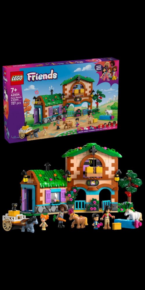 Představujeme vám stavebnici, kterou si zamilují všichni milovníci koní! Stavebnice LEGO® Friends (42654) Ranč s poníky a stáj inspiruje holky a kluky od 7 let k vymýšlení vlastních příběhů o přátelství a zvířátkách. Součástí je sestavitelný ranč s poníky se stájemi a obytnými prostory, vozík, 2 minipanenky, 2 mikropanenky, figurka kočky, 3 figurky poníků a spousta doplňků pro kreativní hraní. Děti se vydají na nekonečná dobrodružství s Aliyou, Liann, Victorií a Ellou. Hřebelcování a krmení 3 poníků bude spousta zábavy! Dokonce tu najdete i funkční výtah na seno, s jehož pomocí přemístíte balíky sena do seníku nebo na vozík. V ranči je útulný obývací prostor a seník, ve kterém budou kamarádky spát nad stájí – splněný sen každého milovníka koní! Objevte další skvělé stavebnice ze světa LEGO Friends (prodávají se samostatně). Tato stavebnice je kompatibilní s aplikací LEGO Builder, která přináší intuitivní stavitelské dobrodružství. V ní děti můžou přibližovat a otáčet modely, ukládat své stavebnice a sledovat svůj postup při stavění.