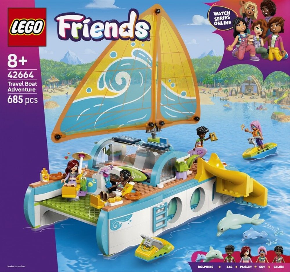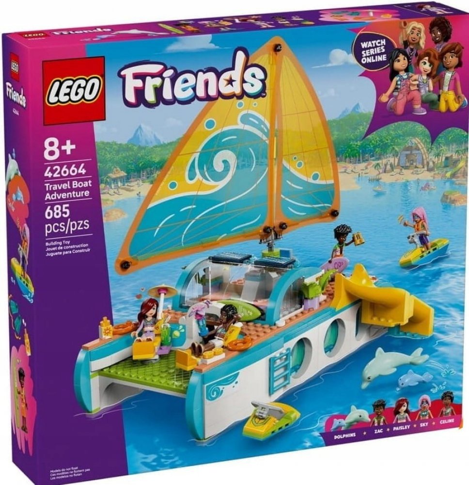 Představujeme vám zábavnou dárkovou stavebnici, která potěší všechny malé cestovatele! Stavebnice LEGO® Friends (42664) Dobrodružství na jachtě pro holky a kluky od 8 let obsahuje 4 minipanenky LEGO Friends a spoustu doplňků pro nápadité hraní. Propracovaná loď je plná realistických prvků, jako je plachta, která se pohybuje, když děti otáčejí kormidlem! Děti si vymyslí příběhy o Paisley, Zacovi, Celine a Sky, kteří se vydali na dobrodružnou plavbu lodí. V lodi najdete prostor na vaření, stolování, odpočinek a spaní – takže se skvěle hodí na vymýšlení nových příběhů. Objevte vířivku s nafukovačkou, herní koutek, prostor na spaní se 4 postelemi, sprchu a toaletu. Odejměte horní část jachty a získejte přístup k propracované kuchyňce s jídelnou. Děti objeví celou řadu doplňků během vaření a stolování s postavami. Mezi další prázdninové doplňky patří dalekohled na pozorování samice delfína a jejího mláděte, 2 vodní skútry, surf, ploutve, herní ovladače a další.