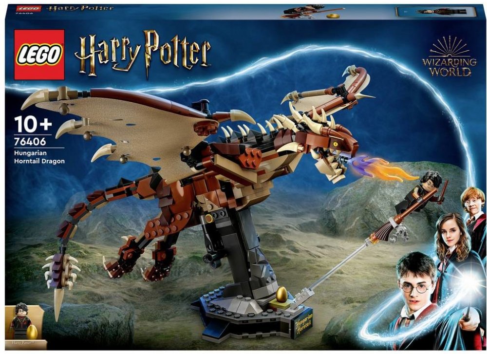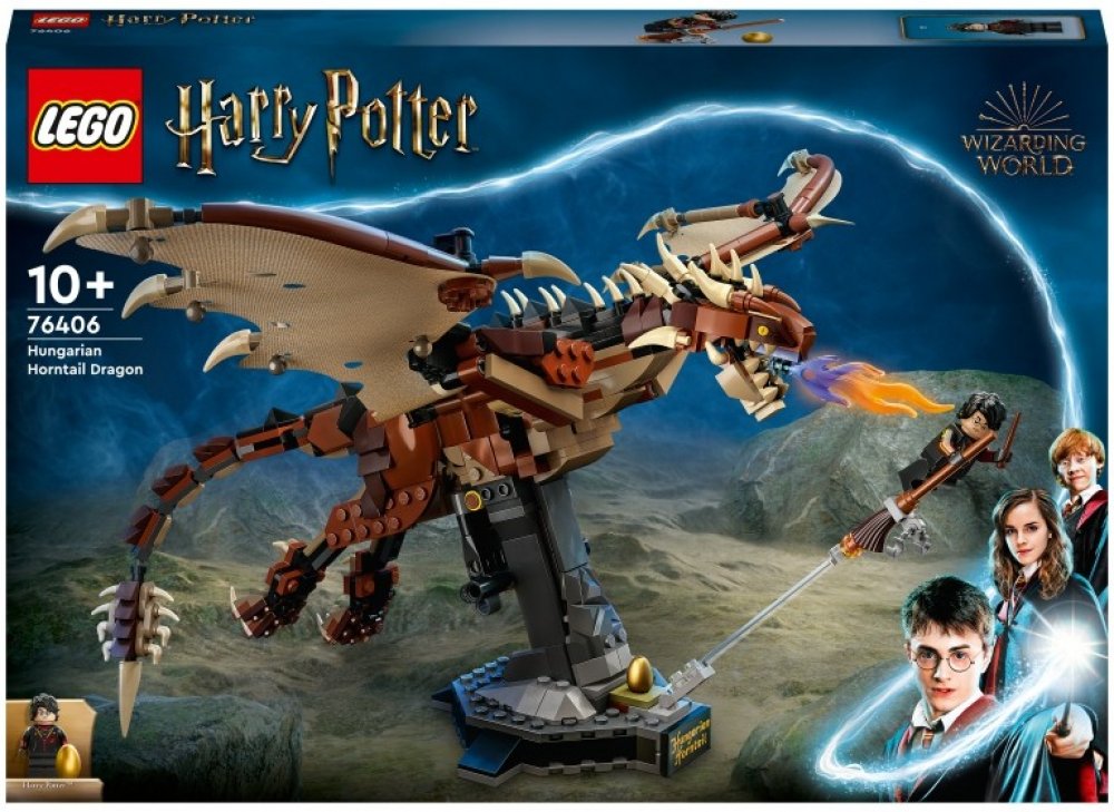 Stavebnice LEGO® Harry Potter™ Maďarský trnoocasý drak (76406) umožňuje fanouškům filmů z prostředí světa čar a kouzel postavit a vystavit si model jednoho z nejobávanějších draků v historii kouzel. Tato replika legendárního oheň plivajícího stvoření je určena čarodějkám, kouzelníkům a mudlům starším 10 let.