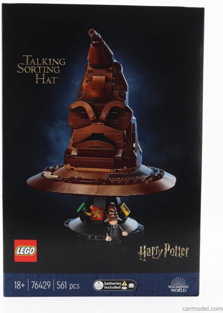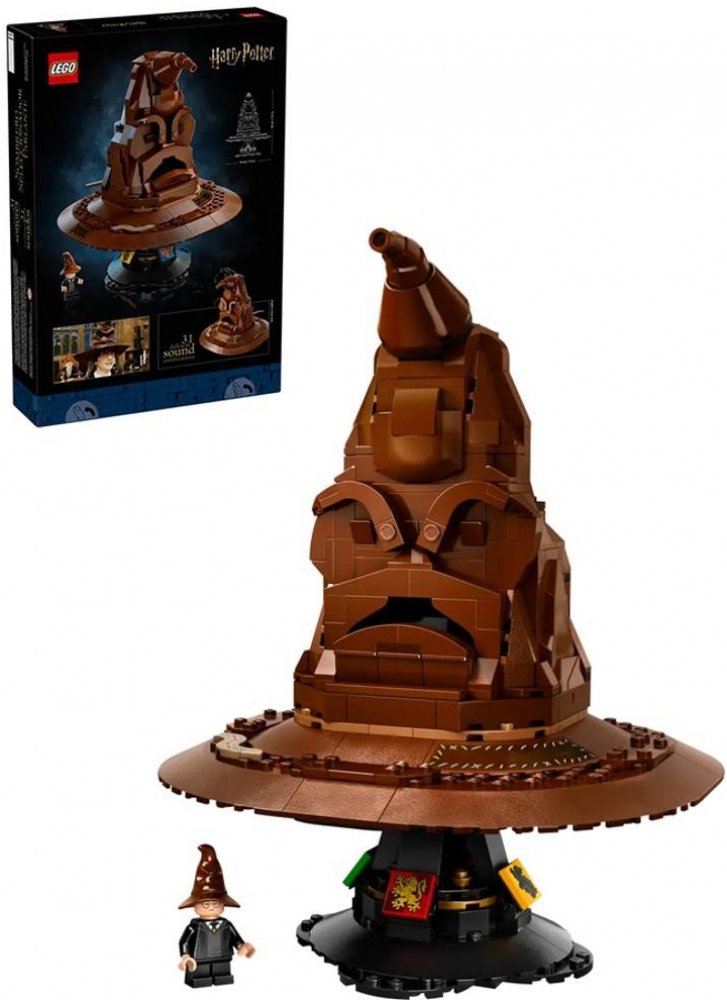 Od klobouku uslyšíš hned 31 zvuků - nikdy ale nevíš dopředu, který. Poví ti, do které koleje patříš nebo zahraje píseň. Podstavec je zdobený erby bradavických kolejí, takže vystavený Moudrý klobouk perfektně ozdobí třeba tvůj obývák nebo pracovnu. Součástí je i minifigurka Harryho Pottera s malým kloboukem.