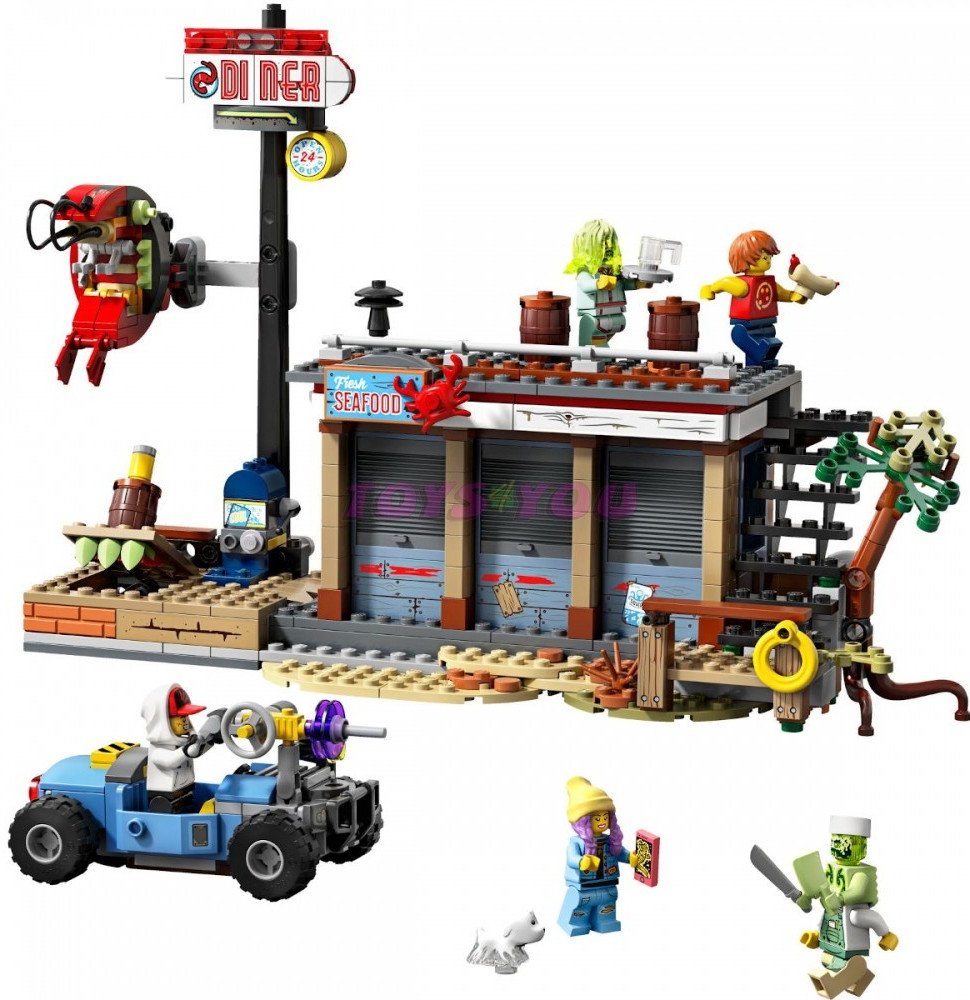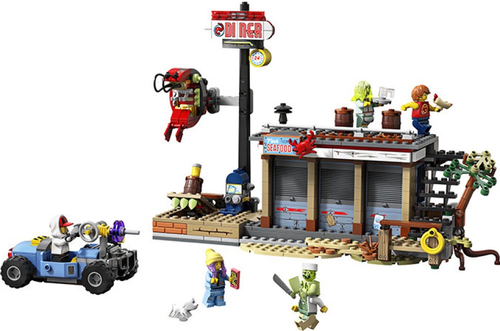 - Součástí je také parádní motokára s místem pro 2 minifigurky, propracovaná kuchyň restaurace a velká cedule s krevetou, kterou může posednout duch.