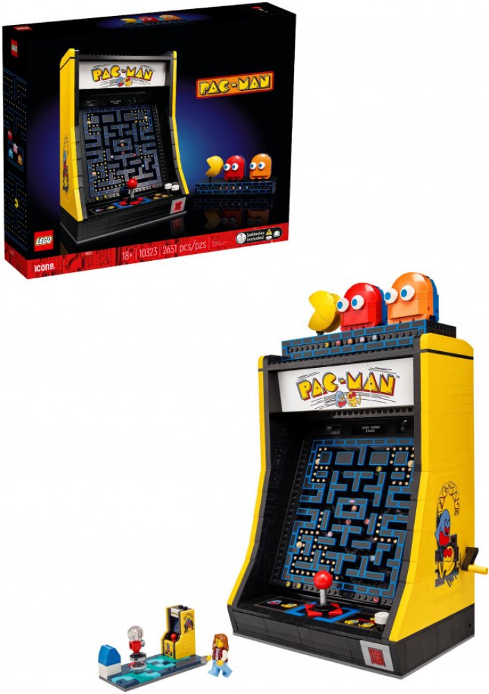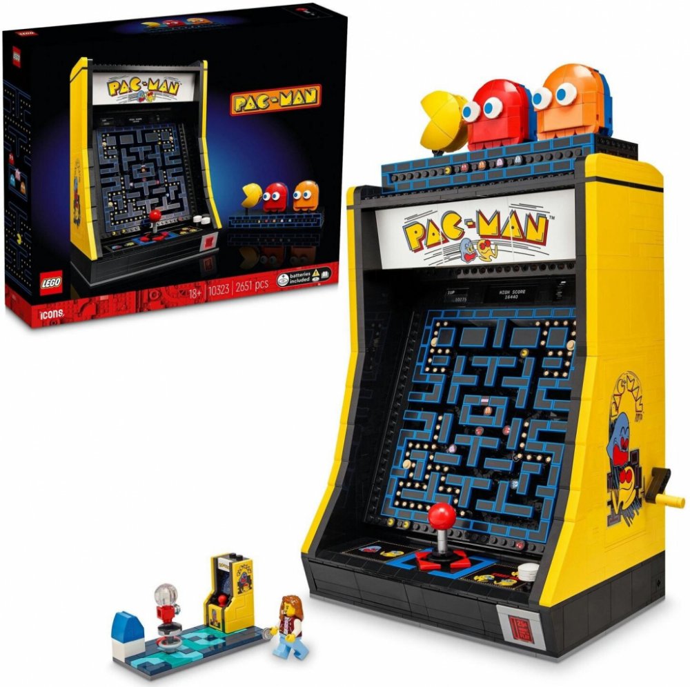 LEGO® stavebnice LEGO® ICONS™ 10323 Arkádový automat PAC-MAN nabízí dospělým stavitelům možnost sestavit věrnou repliku slavného arkádového automatu ze 80. let. Sada obsahuje 2 651 dílků, které tvoří detailní model s autentickými prvky, jako je funkční mechanismus pohybu PAC-MANa a duchů Blinky a Clyde. LEGO® ICONS™ 10323 kombinuje zábavu z konstrukce s nostalgií a precizním zpracováním, které potěší každého fanouška retro her.