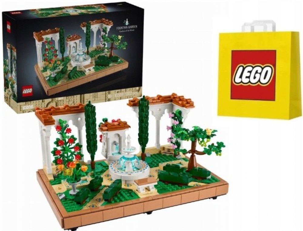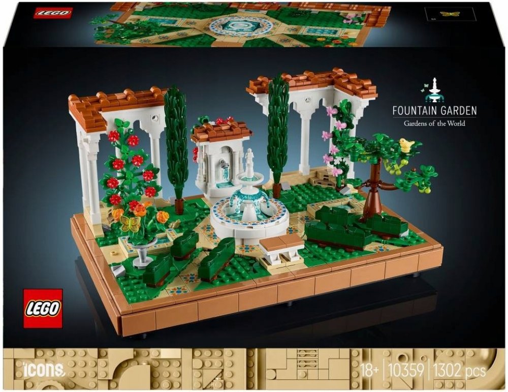 - Co najdete v krabici – LEGO® Zahrada s fontánou obsahuje stupňovitou fontánu, lavabo, 2 cypřiše, kvetoucí vinnou révu, 4 pergoly a dlážděné cestičky a figurku můry, ptáka a žáby