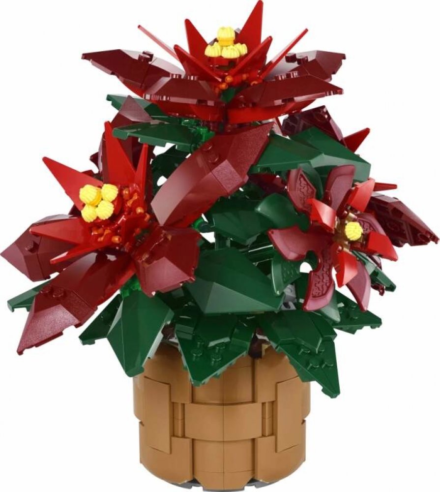Polohovatelná rostlina LEGO® – Tato replika oblíbené vánoční rostliny z kostek LEGO je polohovatelná a skládá se ze zelených listů a 5 hvězdicovitých shluků červených listů (listenů) se žlutými cyathiemi uprostřed.