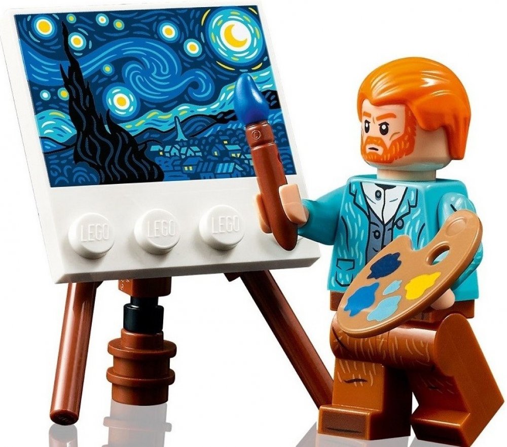 - Nastavitelný výstavní podstavec pro minifigurku Vincenta van Gogha – vystavte si minifigurku se štětcem a paletou před malířským stojanem s miniaturní verzí obrazu Hvězdná noc