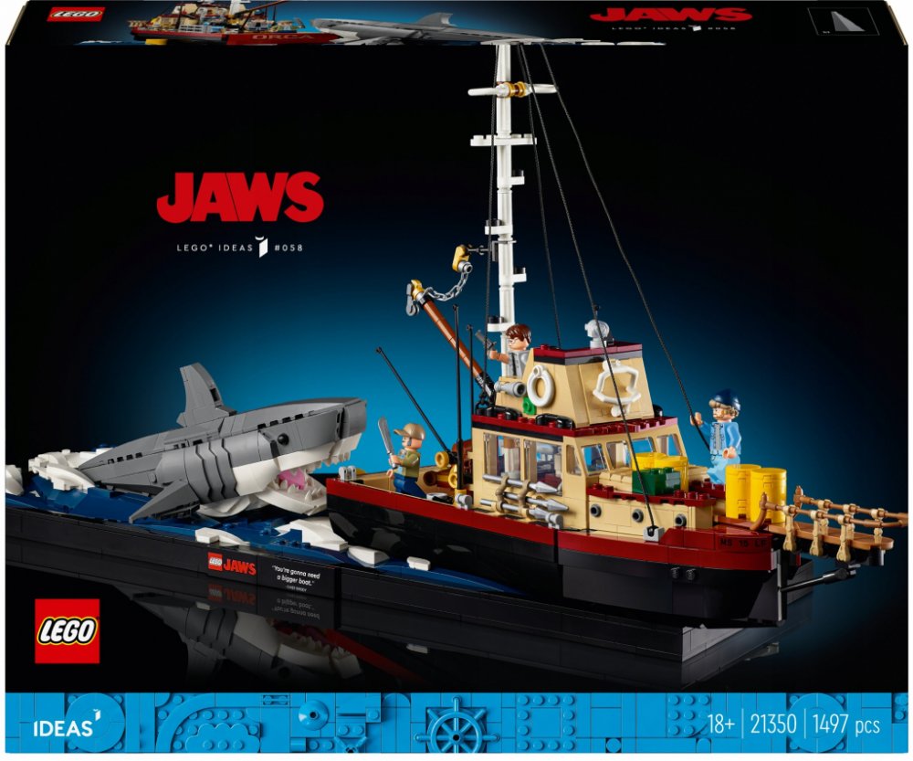 LEGO® Ideas 18 let 1497 ks dekorace Ideas pro dospělé LEGO® 2024 Jen společně Dlouhodobý projekt Pouze na polici 1 model 59 × 20 × 35 cm Martin Brody, Matt Hooper, Sam Quint červená, béžová, černá, šedá, modrá 3 ks