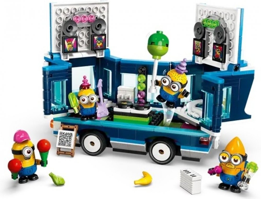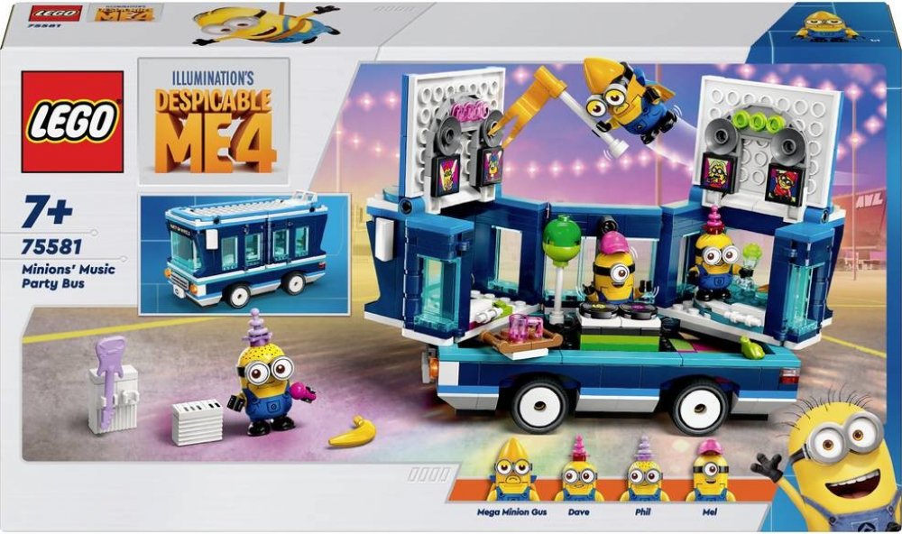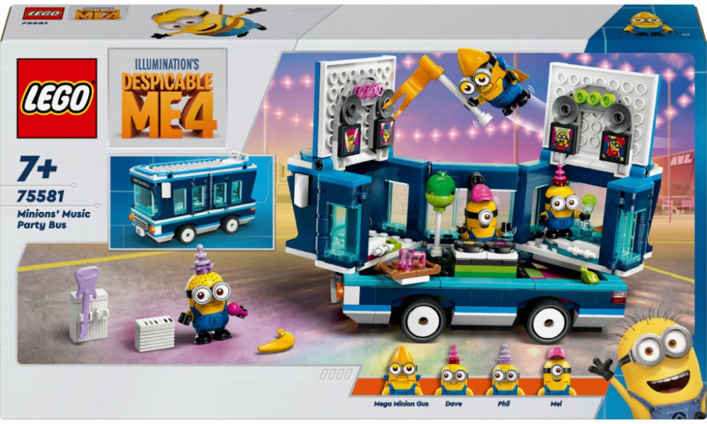 Ve stavebnici najdete 4 figurky mimoňů: Phila, Mela, Davea a létajícího mega mimoně Guse, který se poprvé objeví ve filmu Já padouch 4. Součástí autobusu je sedadlo řidiče a tyč na střeše, na kterou se zavěsí Gus. Otevřete boční strany a střechu autobusu a objevte taneční parket, mixážní pult, elektrickou kytaru, klavír, mikrofon, osvětlení, reproduktory a vířivku! Vyndejte jednotlivé prvky a pusťte se do hraní i mimo autobus. Tato zábavná stavebnice pro děti se pyšní výraznými barvami a najdete v ní úchvatné doplňky včetně vlaječky, balónku, zmrzliny, klobouků, nápojů, světel, reproduktorů a obrazovek. S aplikací LEGO Builder si děti navíc užijí digitální zábavu.