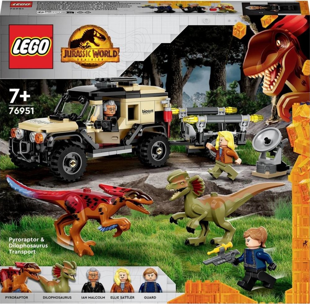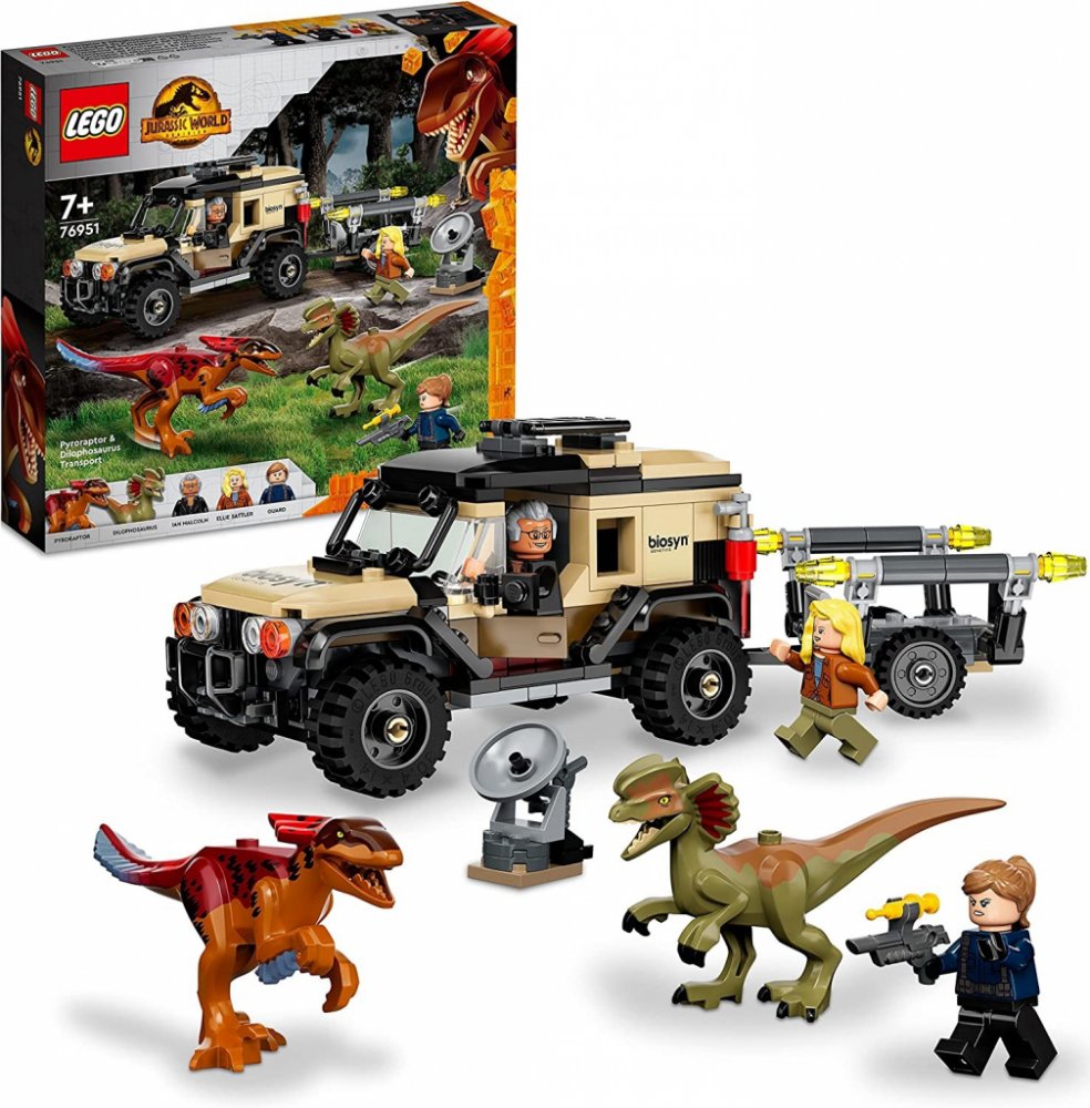 Terénní auto a 2 dinosauří figurky – stavebnice Přeprava pyroraptora a dilophosaura (76951) to je záruka nekončící porce akčního a zábavného hraní 2 dinosauři a 3 minifigurky – Ian Malcolm, doktorka Ellie Sattlerová a strážce parku, a navíc polohovatelné dinosauří figurky pyroraptora a dilophosaura z filmu Jurský svět Nadvláda
