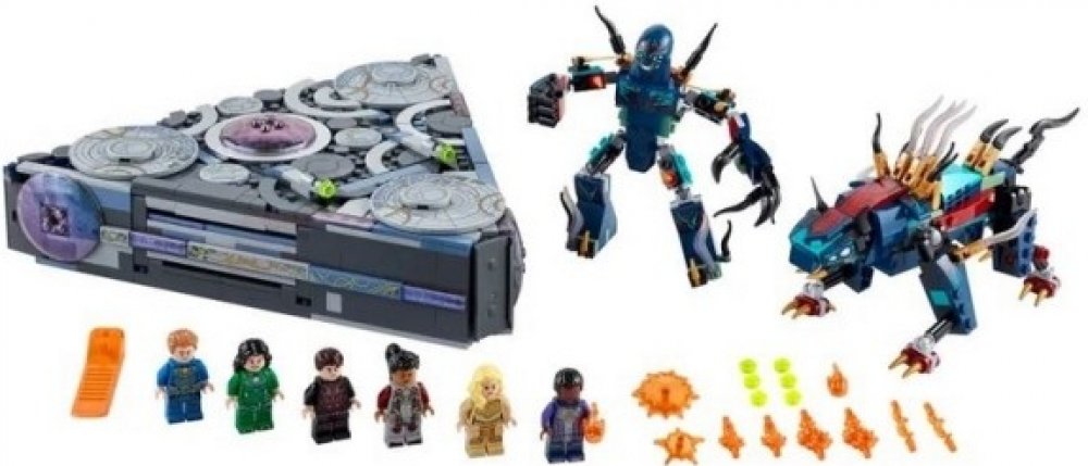 - Součástí je 6 minifigurek – Makkari, Ikaris, Thena, Sersi a exkluzivní Druig a Phastos – dále 2 akční figurky Deviantů, včetně jejich vůdce Kroa, kosmické lodi, zbraní a doplňků.