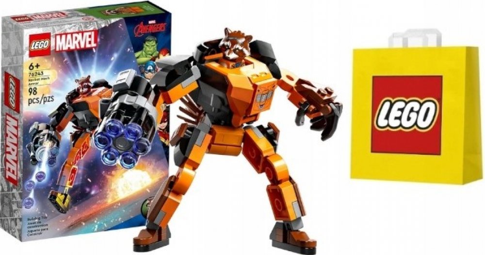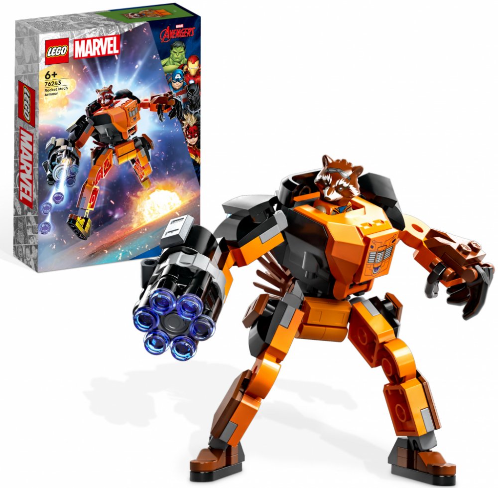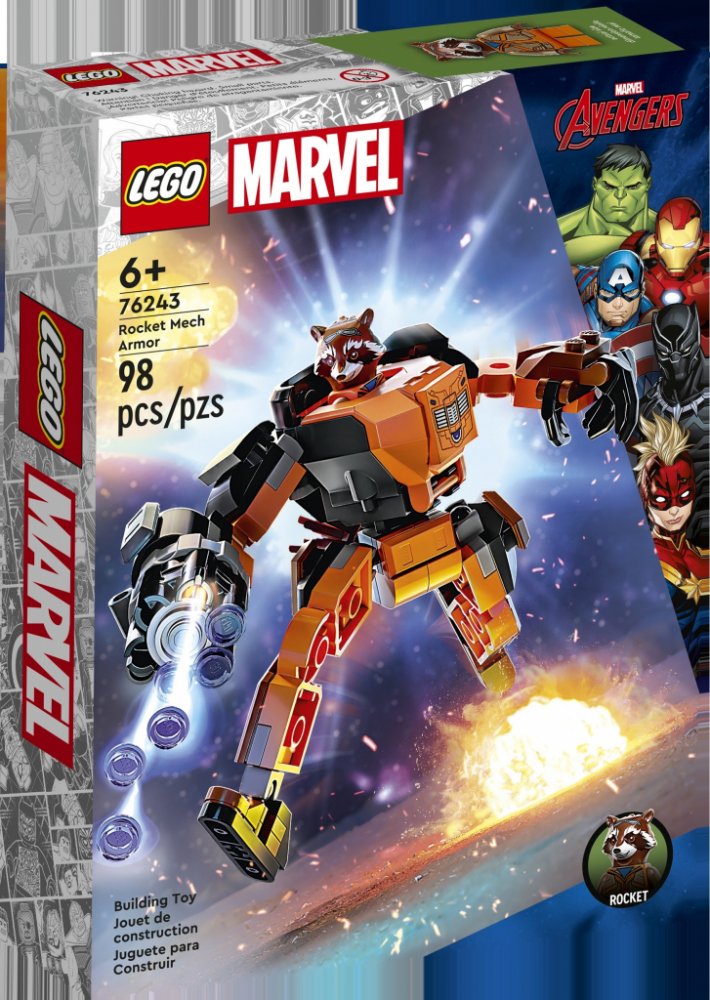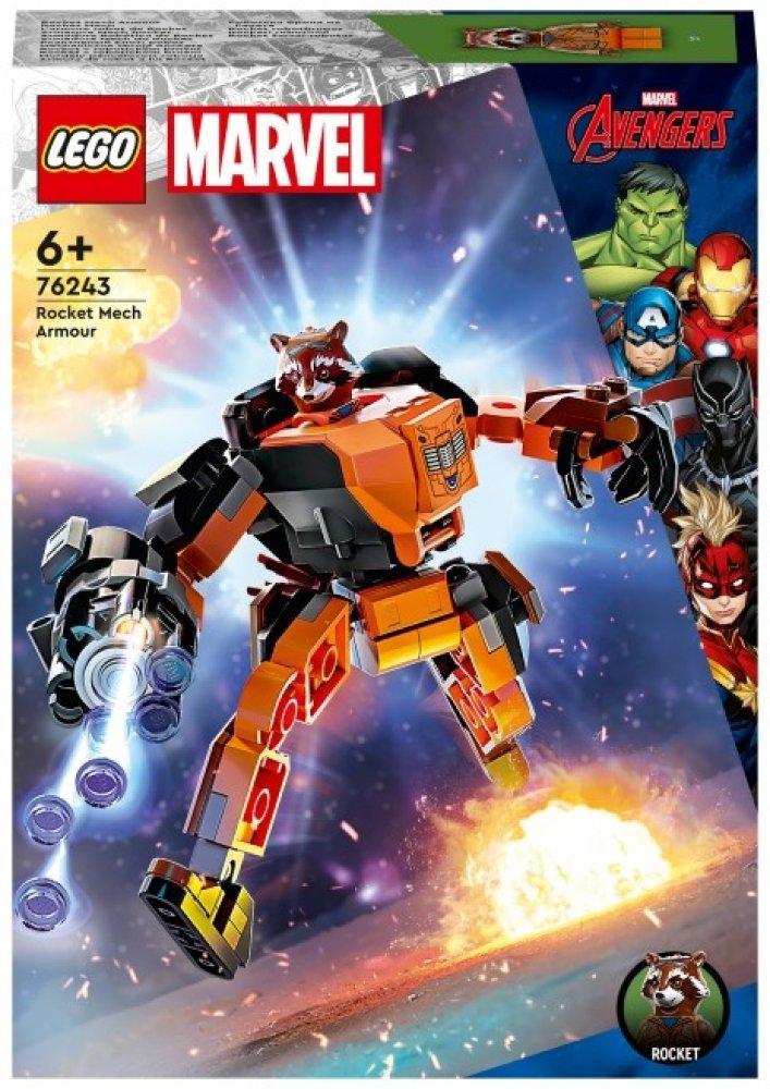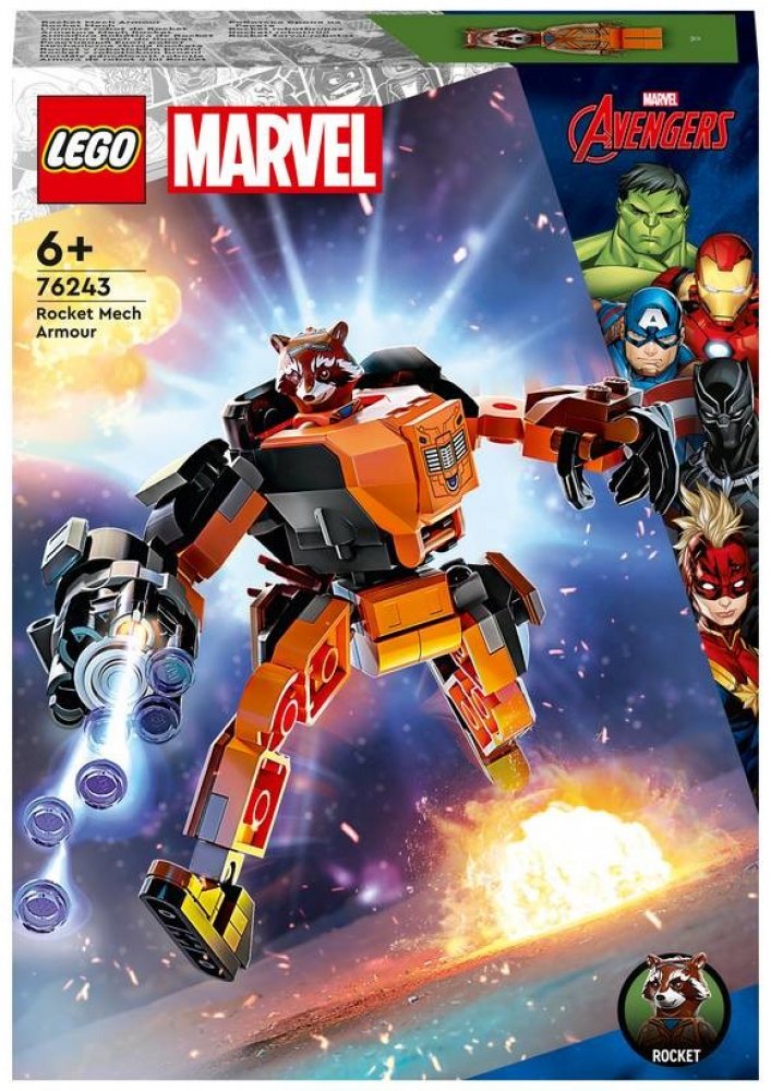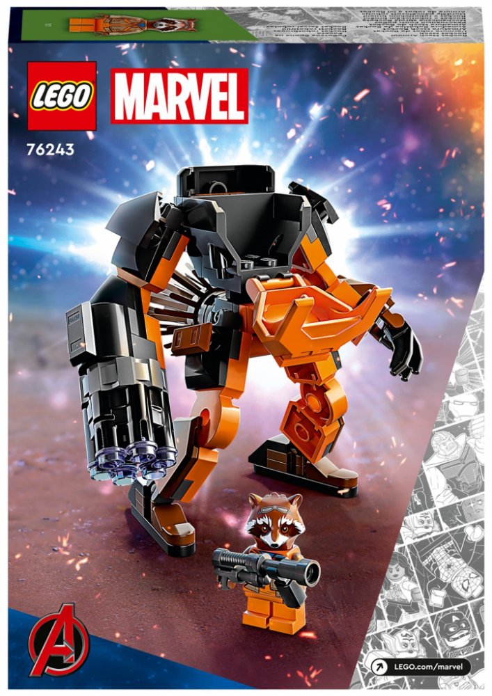 LEGO 76243 - Rocket v robotickém brnění z produktové řady LEGO MARVEL - AVENGERS. Dětské plastové kostky v krabici.