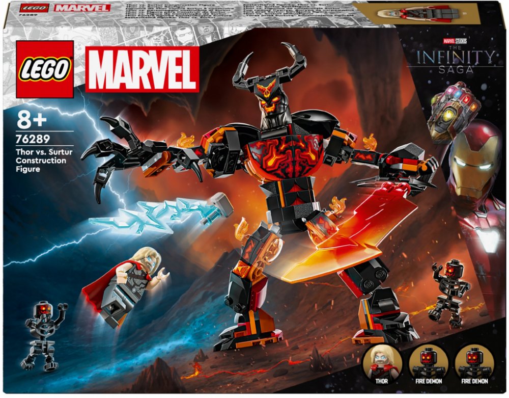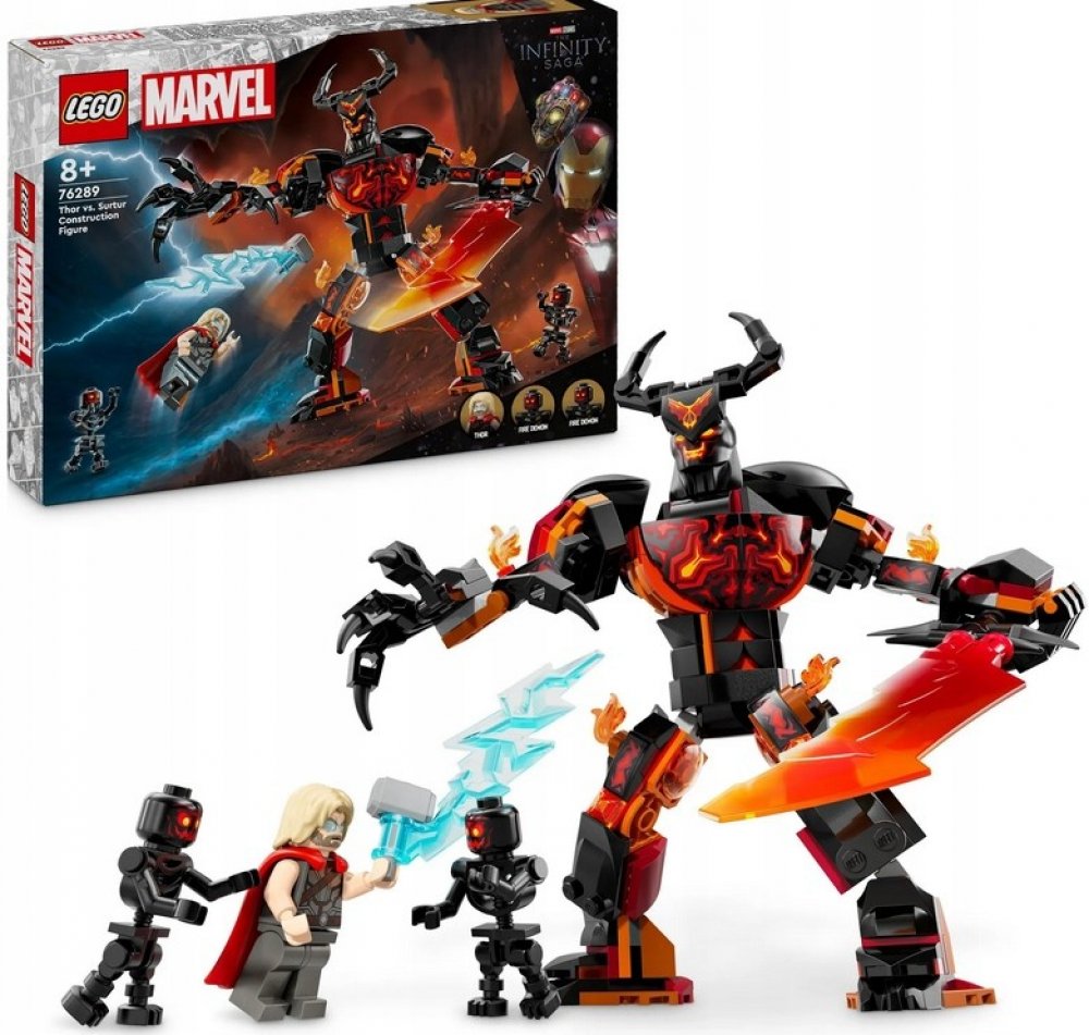 Stavebnice LEGO® Marvel Sestavitelná figurka: Thor vs. Surtur staví minifigurku superhrdiny proti obří sestavitelné figurce s plamenným mečem! - Sestavitelný model LEGO® Marvel Thora a Surtura z filmu Thor: Ragnarok od Marvel Studios - Obsahuje minifigurky Thora a 2 ohnivých démonů a sestavitelnou kloubovou figurku Surtura - Děti staví proti sobě minifigurku superhrdiny a obra Surtura s plamenným mečem - Průhledný spojovací prvek umožňuje minifigurce Thora „vznášet se“ - Tato stavebnice Avengers je skvělý nápad na dárek pro fanoušky Marvelu a stavebnic - Děti mohou přibližovat a otáčet stavebnice ve 3D pomocí intuitivní aplikace LEGO® Builder - Prohlédněte si celou řadu LEGO® Marvel a objevte další dobrodružství se superhrdiny - Stavebnice se skládá z 245 dílků a sestavitelná figurka ve stoje měří přes 18 cm Superhrdinská stavebnice LEGO® Marvel (76289) Sestavitelná figurka: Thor vs. Surtur vychází ze scény z filmového hitu Thor: Ragnarok od studia Marvel. Díky kultovním postavám, vzrušujícím funkcím a nekonečným možnostem na nápaditá dobrodružství se superhrdiny představuje tato stavebnice LEGO Marvel skvělý dárek pro děti od 8 let. Stavebnice obsahuje 3 minifigurky: Thora a 2 bojovníky ohnivých démonů. Stejně jako ve filmu se Thor osvobodí z řetězů, které ho svazují, a bojuje se Surturem. Kloubovou sestavitelnou figurku Surtura lze polohovat do různých akčních pozic. Třímá velký ohnivý meč a na hlavě má rohatou korunu. Díky průhlednému konektoru si děti mohou minifigurku Thora připevnit k sestavitelnému Surturovi, takže to vypadá, jako by Avenger létal. Pro doplňkovou digitální zábavu mohou stavitelé přibližovat a otáčet modely ve 3D a sledovat svůj pokrok pomocí intuitivní aplikace LEGO Builder. LEGO76289.