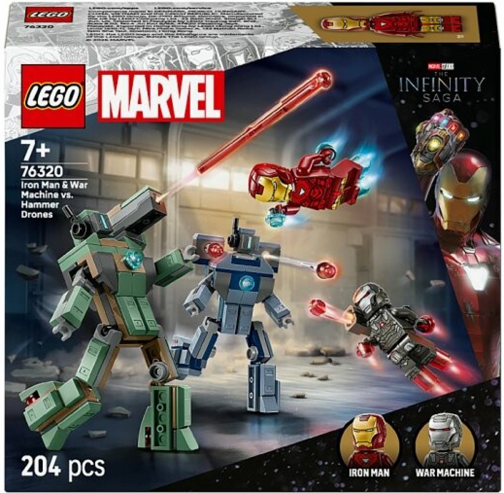 Připomeňte si velkolepou bitevní scénu z filmu Iron Man 2 od studia Marvel s touto stavebnicí. Součástí jsou minifigurky Iron Mana a War Machine a 2 sestavitelné Hammerovy Drony. Drony jsou plně pohyblivé, takže je děti můžou napolohovat a užít si s nimi dynamické realistické hraní. Zelený Hammerův Dron má na rameni pružinový vystřelovač. Modrý Hammerův Dron má na obou ramenech vystřelovač aktivovaný stlačením. War Machine má červené blastery na rukou a na nohou a na rameni vystřelovač. Iron Man má modré blastery na rukou a nohou a může držet dílky v podobě laserového paprsku. Pro ještě větší digitální zábavu můžou stavitelé přibližovat a otáčet modely ve 3D a sledovat postup stavění pomocí intuitivní aplikace LEGO Builder. Stavebnice obsahuje 204 dílků.