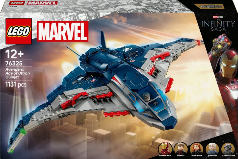 Sestavitelný model stíhačky Quinjet obsahuje 5 minifigurek: Black Widow s motorkou, Iron Mana, Quicksilvera, Ultimate Ultrona a Hawkeye s lukem a šípy. Minifigurky lze připevnit na více míst v letadle. Quinjet má otevírací kokpit, 2 vystřelovače vepředu a úložný prostor pro zbraně Black Widow a Hawkeyeův luk. Zadní dveře lze otevřít, aby děti mohly vjíždět a vyjíždět s motorkou. Součástí je odnímatelný otočný stojan, díky kterému si oblíbenou stíhačku můžete prohlédnout ze všech úhlů. Pro ještě větší digitální zábavu stavitelé můžou přibližovat, otáčet modely ve 3D a sledovat svůj pokrok pomocí zábavné a intuitivní aplikace LEGO Builder. Stavebnice obsahuje 1131 dílků.