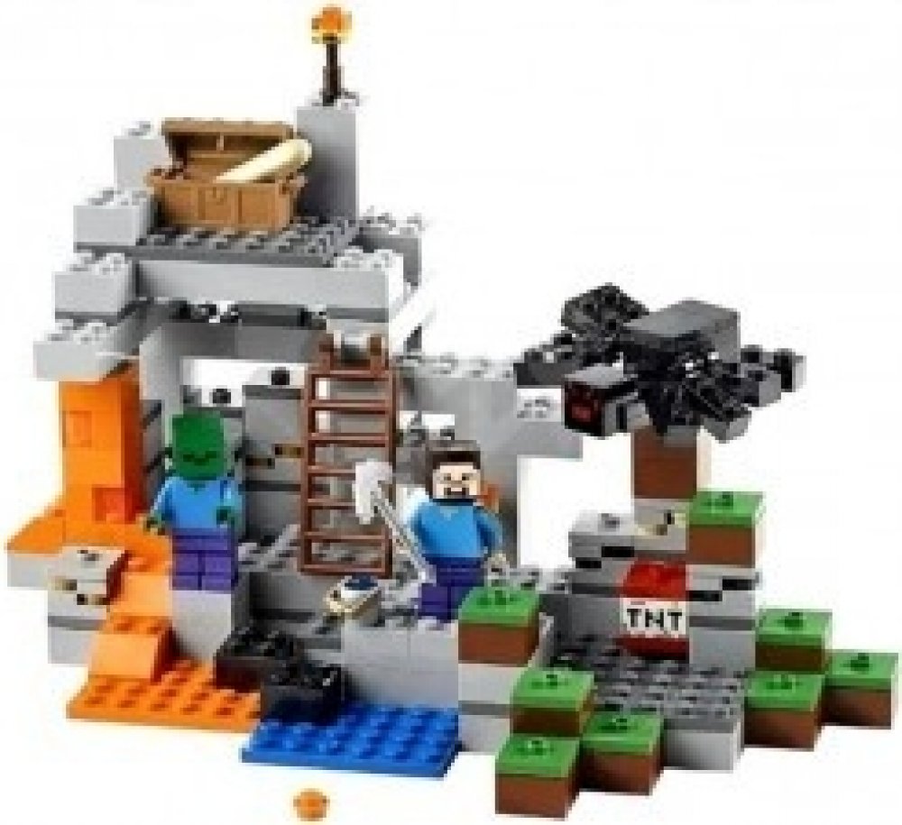 Vydejte se do jeskyně na nebezpečnou výpravu za životně důležitými zdroji. Ohánějte se železným krumpáčem, kopejte a bojujte proti nepřátelským bandám zombie a pavouků. Odstřelujte cenné rudy a nerosty pomocí dynamitu a vyrábějte vzácný obsidián mísením tekoucí vody a lávy. Po skončení bojů a dolování znovu načerpejte energii z bedny s chlebem. Postupujte opatrně! Přestavěním sady získáte další modely LEGO Minecraft. Obsahuje 2 minifigurky s různými doplňky: Steve a zombie, navíc pavouka.