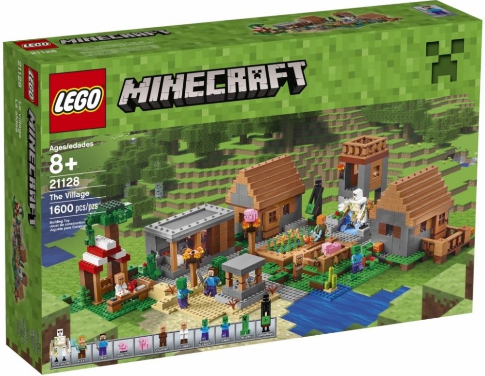 Obsahuje 4 minifigurky: Steva, Alexe, zombie a zombie vesničana, navíc Creeper™, enderman, prase, selátko, železný golem a 2 vesničané (farmář a knihovník).