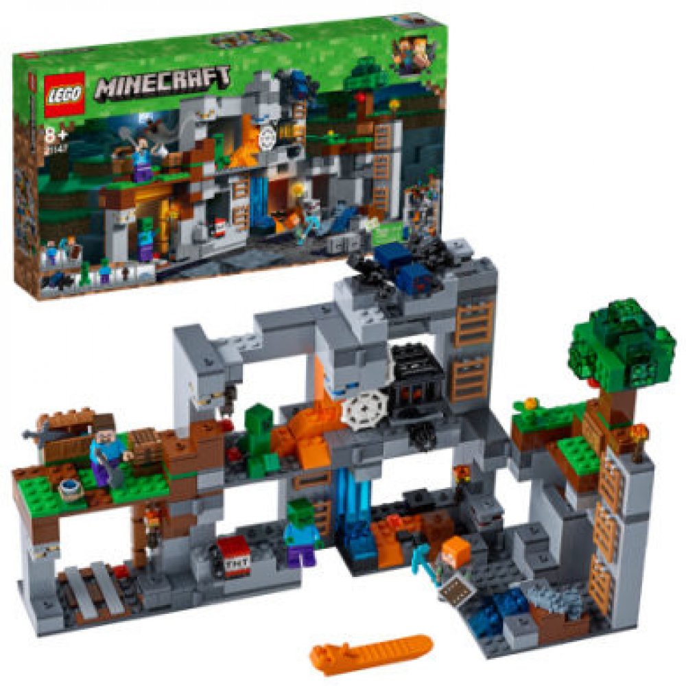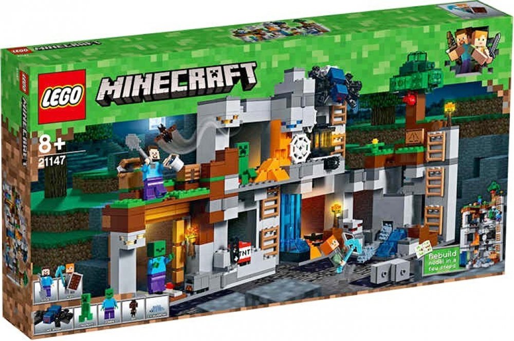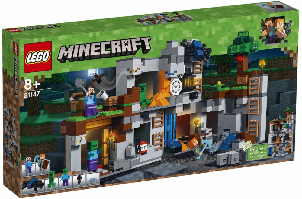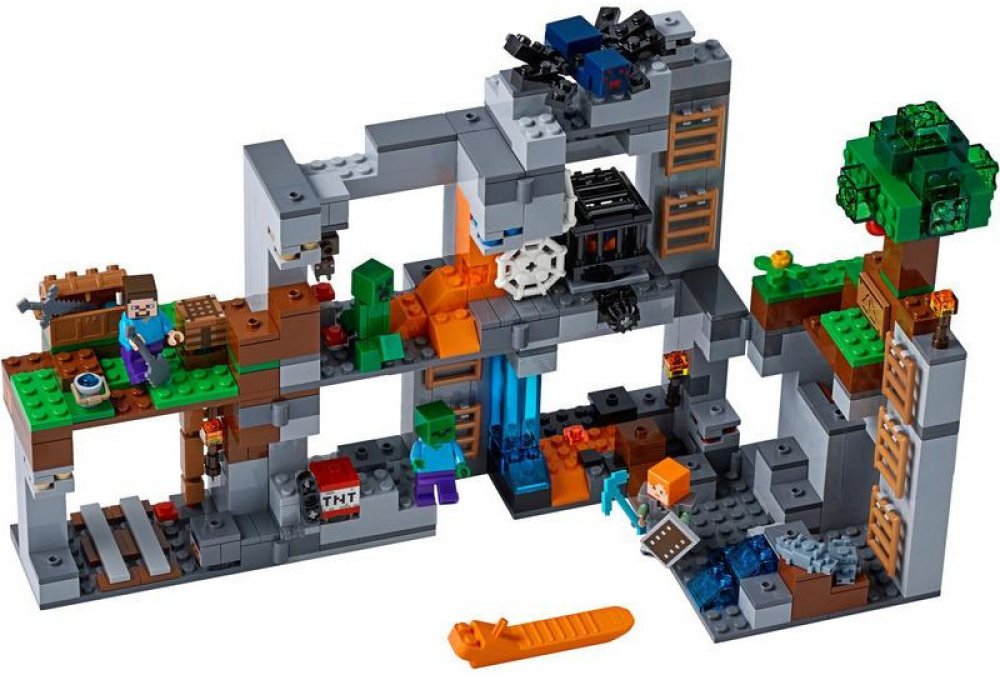 - Obsahuje sestavitelnou lokaci ze světa LEGO® Minecraft™, skalní a důlní podlaží propojené řadou žebříků, otáčející množič jeskynních pavouků, výbušnou funkci dynamitu, funkci vyvolávání rybenek, strom, pavučiny, houby, obsidián, lávu a vodopády, a 7 různých druhů rudy.