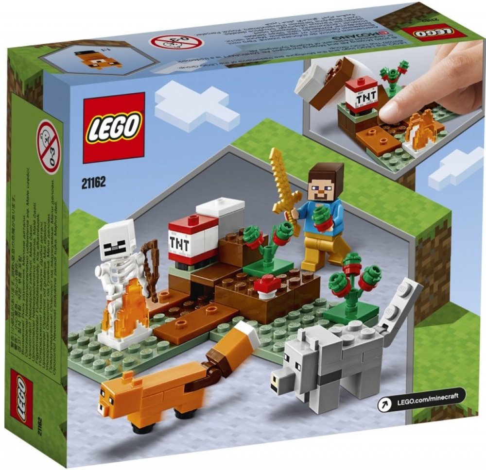 LEGO® Minecraft 7 let 74 ks stavby Minecraft pro kluky a holky LEGO® 2020 Ano, od 7 let Do 1 hodiny Běžné hraní 1 model 9 × 9 × 3 cm Steve, kostlivec, vlk hnědá, béžová, modrá, červená, bílá 2 ks