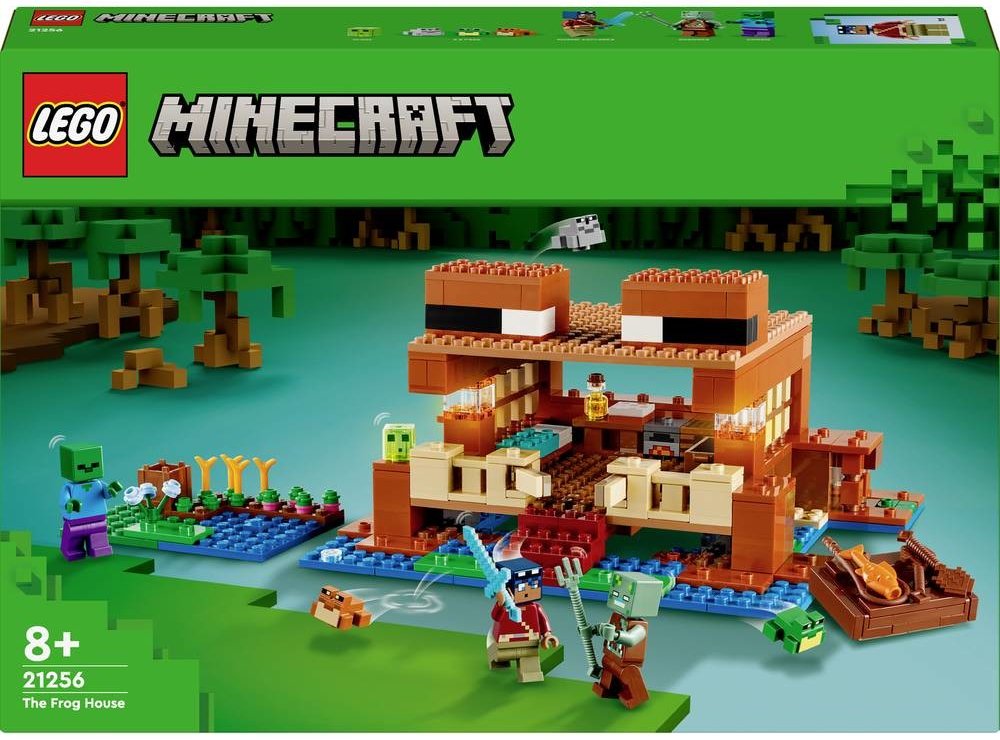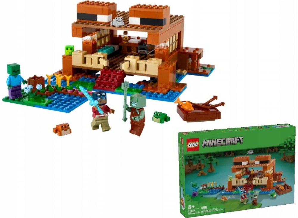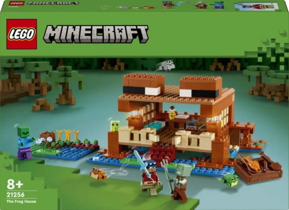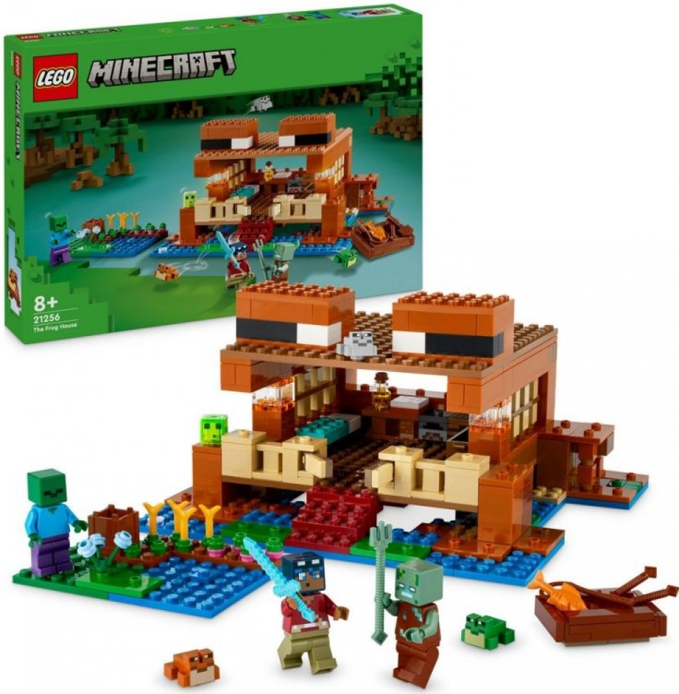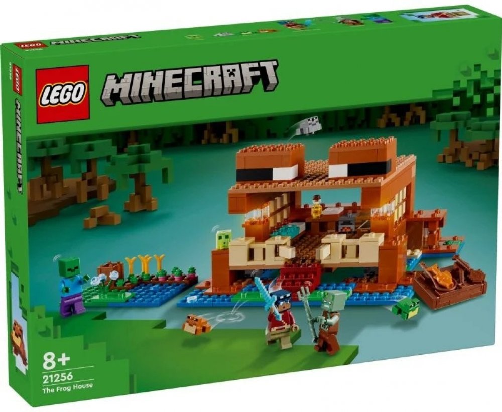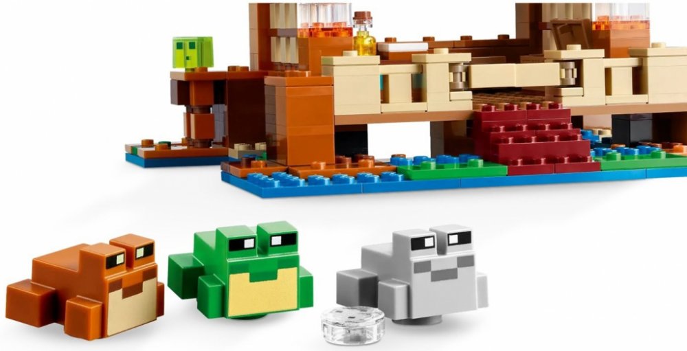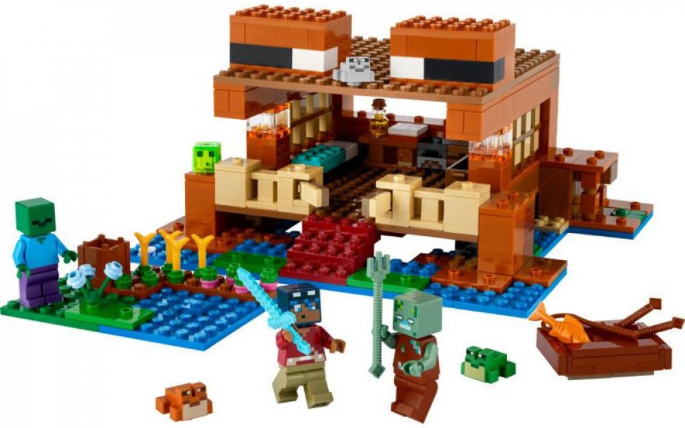 Tento domek má tvar žáby. Součástí jsou figurky oblíbených postav ze hry. Žabí domek je perfektní stavebnice pro děti, které milují Minecraft. Najdou v ní spoustu detailů – postel, stolek, pracovní stůl, pec, truhlu, dort a med – a odklápěcí střechu, která umožňuje snadný přístup dovnitř. Venku se nachází farma, z níž mohou hráči sklízet řepu, pšenici a květiny, a jezero, ve kterém lze používat rybářský prut a loďku z tmavého dubu s pádly. Nechybí ani 3 druhy žab (zelená, šedá a hnědá) a sliz, který na žáby speciálně reaguje, jak hráči dobře vědí. Součástí této všestranné stavebnice je hrdina ze světa Minecraft, zombie a utopenec s trojzubcem pro hodiny zábavného hraní. Malí stavitelé mohou přibližovat a otáčet stavebnice ve 3D a sledovat svůj pokrok pomocí aplikace LEGO Builder.