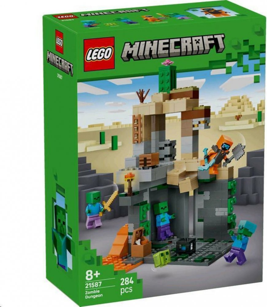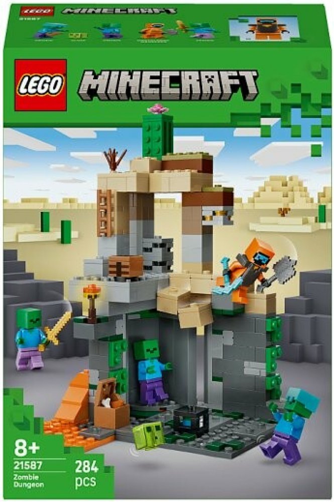 Stavebnice LEGO® Minecraft® Zombie kobka přenese děti od 8 let přímo do napínavého pouštního biomu, kde se musí postavit hordě nebezpečných zombie. V temné kobce plné pastí a herních prvků se odehrává akční příběh, ve kterém hlavní roli hraje tulák v pustině vybavený diamantovým krumpáčem, palcátem a odolným brněním z netheritu. Proti němu stojí sliz a tři zombie, z nichž jedna má kouzelné nohavice a zlatý meč a druhá diamantovou helmu.