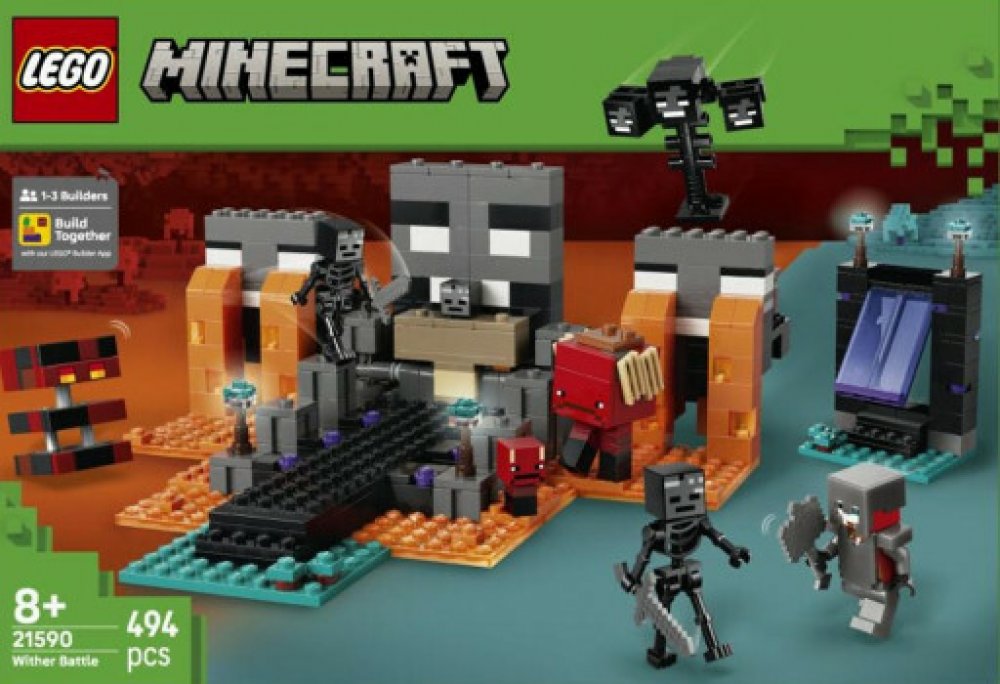 Vydejte se s milovníky Minecraftu do nekonečného světa fantazie se stavebnicí Souboj s Witherem pro holky a kluky od 8 let. Děti se připojí ke karmínovému válečníkovi, který se v deštivém lesním biomu utká se dvěma kostlivci a dalšími nepřáteli a čeká ho napínavé dobrodružství. Tato stavebnice plná akce a autentických detailů ze hry Minecraft obsahuje postavy ze hry, jako je karmínový válečník, 2 Wither kostlivci, chodec, pekelný sliz a sestavitelný Wither. Portál do Netheru a svatyně s pracovním stolem a skrytým Witherem, kterého můžou děti vyvolat výbuchem, vnáší do hry život. Děti si užijí hodiny nápaditého hraní, při kterém budou bojovat s nepřáteli, jezdit na chodci a prožívat velkolepá dobrodružství.