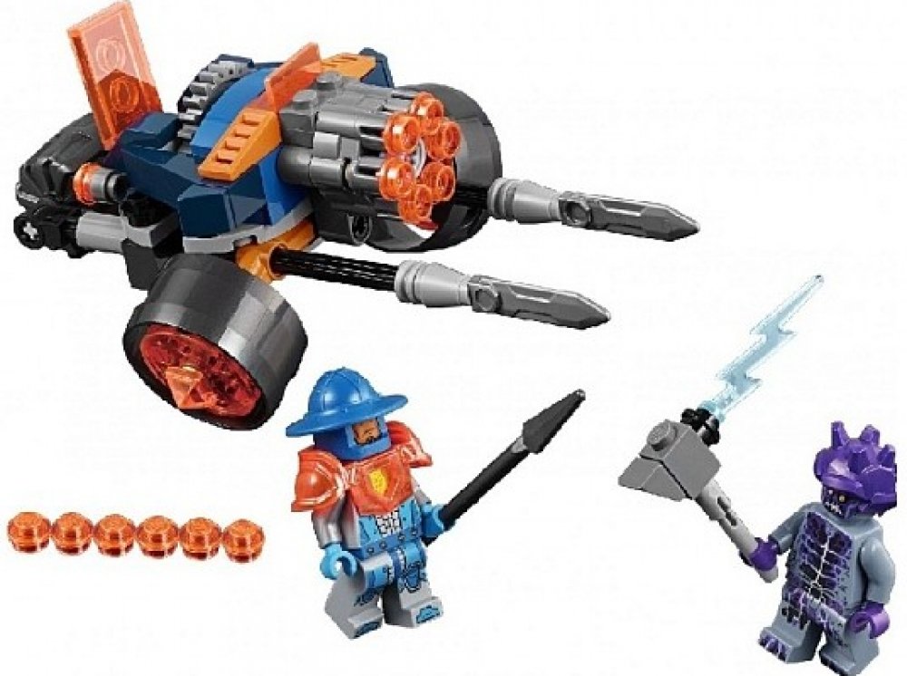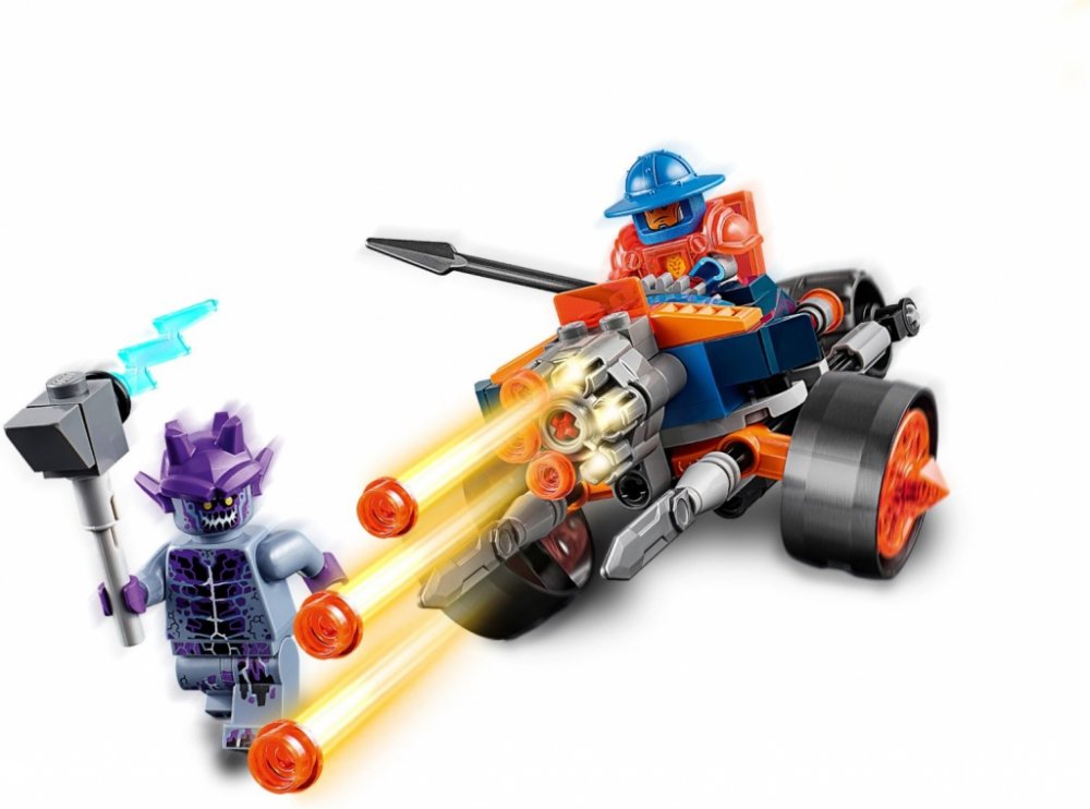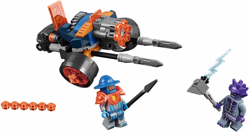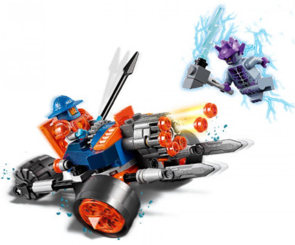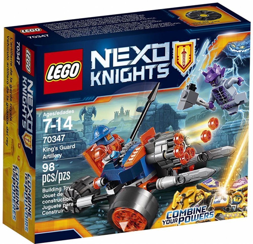 Ochraňuj království Knighton s bitevním strojem Dělostřelectva královy stráže v sadě, která obsahuje kokpit pro minifigurku LEGO® NEXO KNIGHTS™, vystřelovač a přední vysouvací meče, které aktivuješ zadním kolečkem. Obsahuje dvě minifigurky.