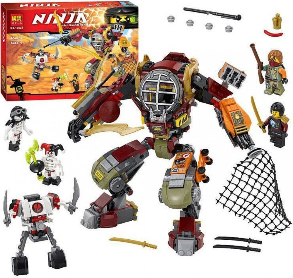 - Robot Salvage M.E.C. obsahuje otevírací kokpit pro mini figurku, pohyblivé ruce a nohy, zlatý luk s pružinovým vystřelovačem, vystřelovač sítě, pušku, prostor pro skladování ukradených pokladů nebo munice, oddělitelný skateboard, 2 zlaté čepele a oddělitelný únikový letoun na robotových zádech pro Ronina nebo Nyu.