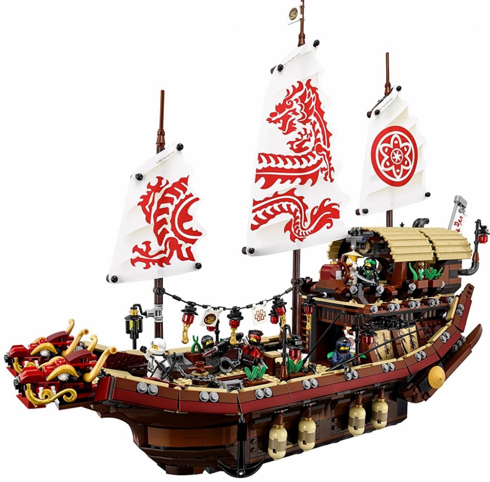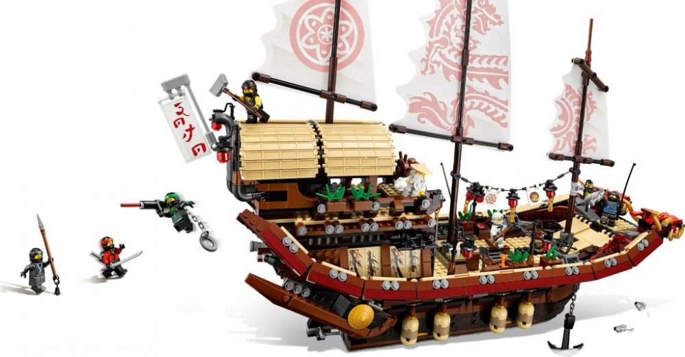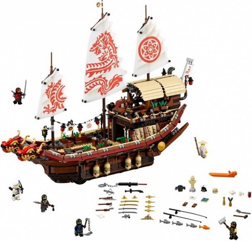 - Odměna osudu obsahuje tři modulární sekce (horní palubu, dojo mistra Wu a střední sekci/trup), dvojitou hlavu draka na přídi, tři zdobené plachty, řetěz s lucernami, dvě navíjecí kotvy, rukojeť v podobě lebky, dva sudy a tři krabice, ložnici mistra Wu s postelí pro minifigurku a příslušenství v trupu, dojo se svitkem, tréninkovou figurínu a tři tréninkové zbraně, navíc zbraně, ukryté v podpalubí.