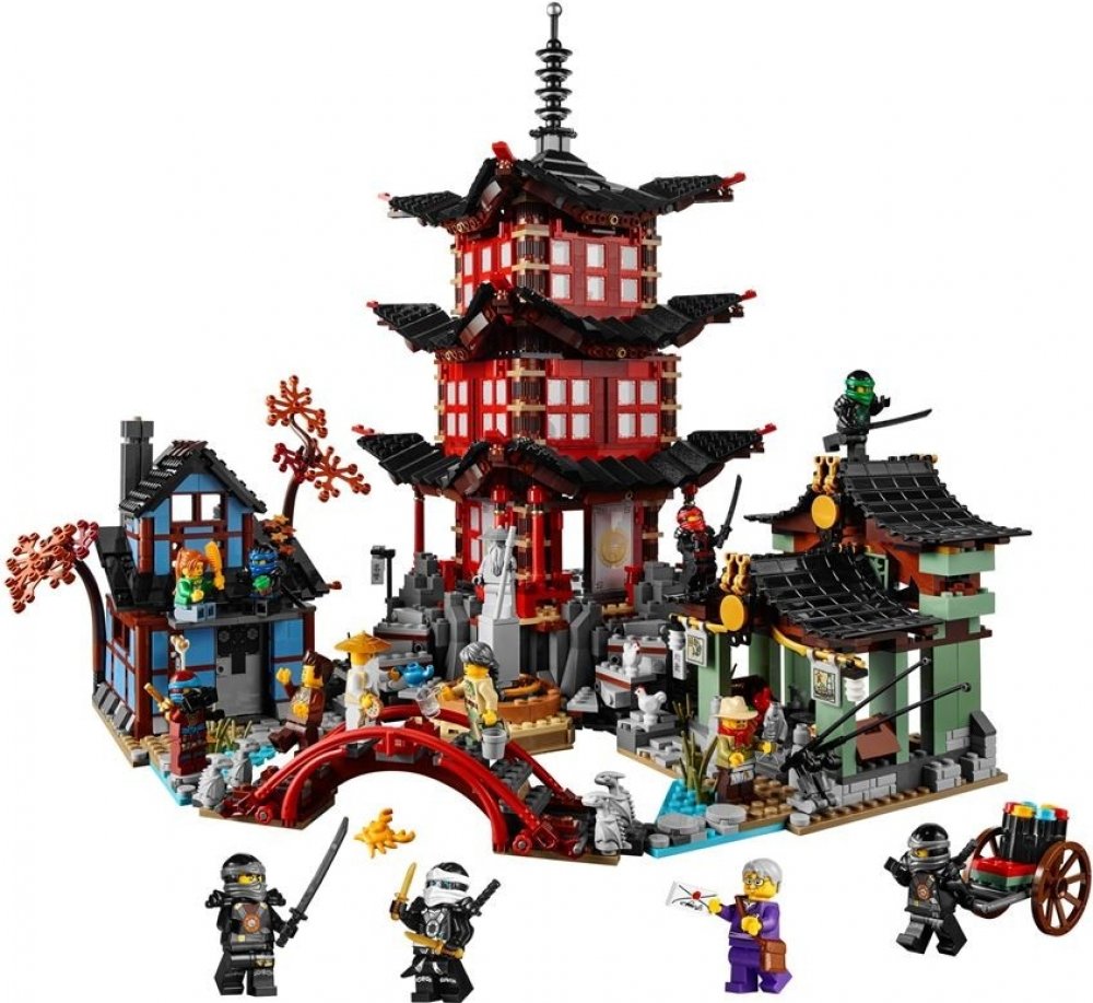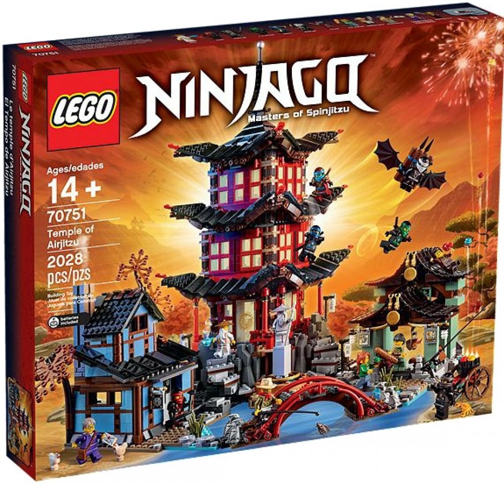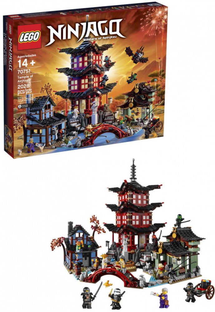 Užij si úžasný LEGO® NINJAGO™ zážitek při stavbě majestátního chrámu Airjitzu a přilehlé vesnice! Vysoce propracovaná budova chrámu má mnoho skvělých architektonických detailů včetně orientálně zdobených oken a posuvných dveří. Komplikované stěny přilehlé kovářské dílny s dřevěnými rámy a krásná kroucená střecha pašeráckého trhu také otestují tvé LEGO stavitelské schopnosti. A vzhledem k tomu, že tato sada jako první obsahuje všechny nindži, a navíc obsahuje i spoustu dalších klíčových postav, můžeš si přehrávat svá oblíbená dobrodružství z NINJAGO. Vezmi si čaj do prostoru předsíně chrámu, trénuj své pohyby nindži v tréninkové místnosti nebo se přidej k Wuovi v jeho studovně a čti si nebo maluj. Objev nindža kluzák nahoře v kovářské dílně, choď po mostě hlídaném kamennými draky a najdi poklad ukrytý na pašeráckém trhu. Potom ve svém pokoji zhasni světlo a sleduj chrámové svítící otočné stínové divadlo!