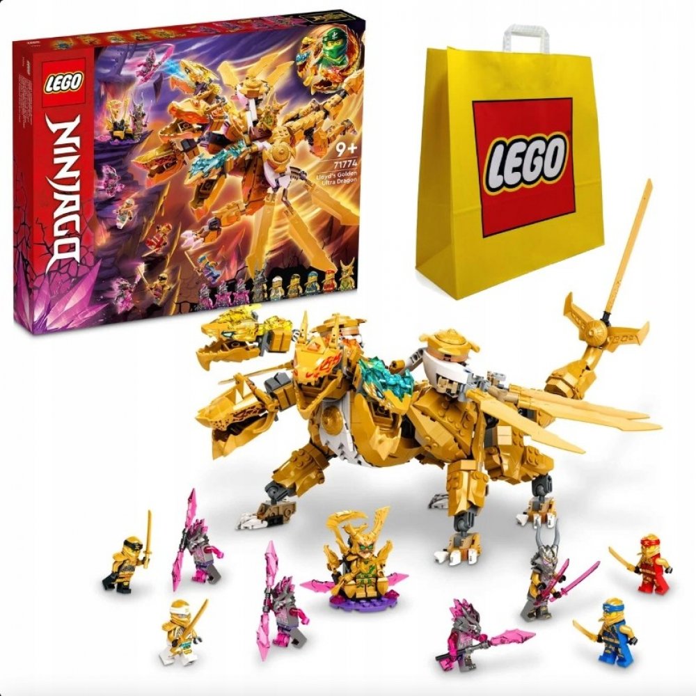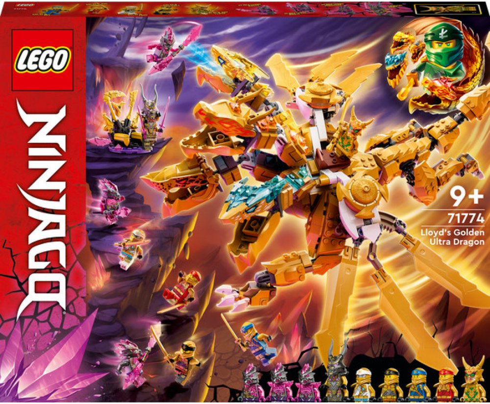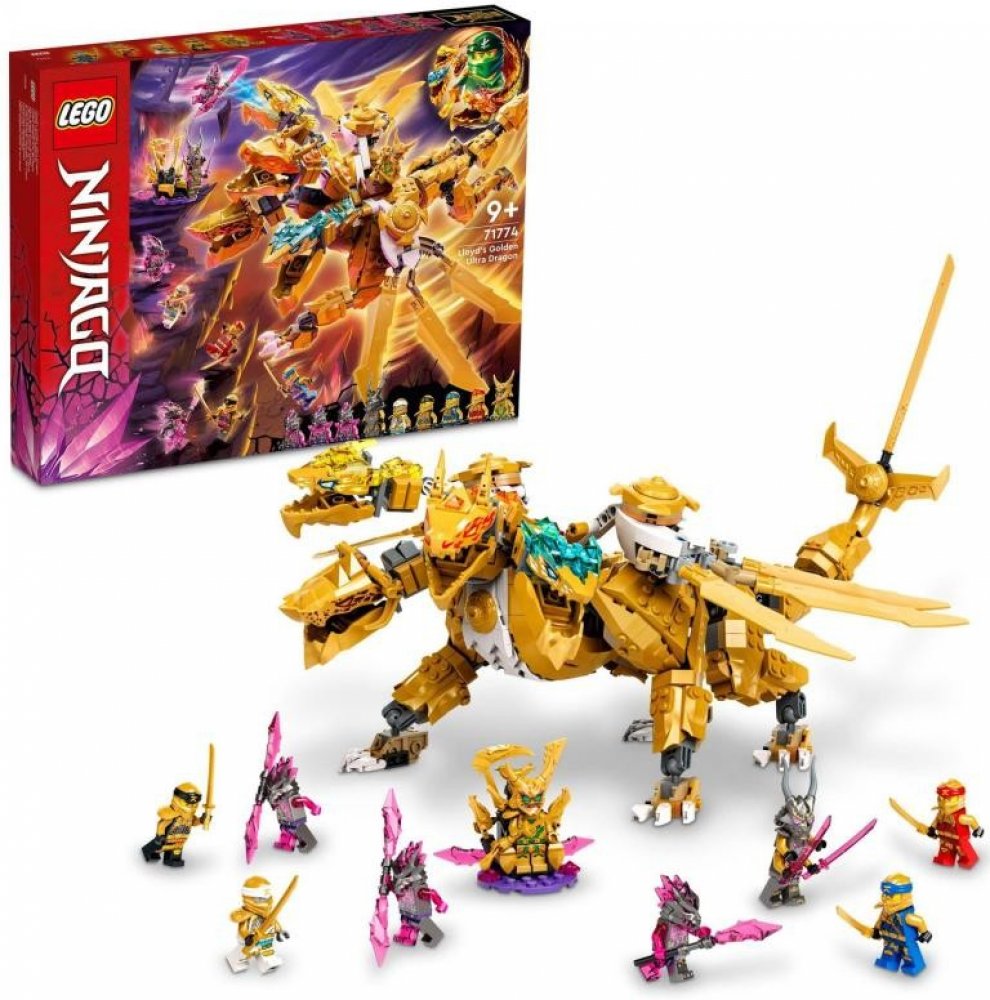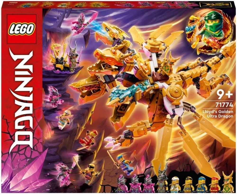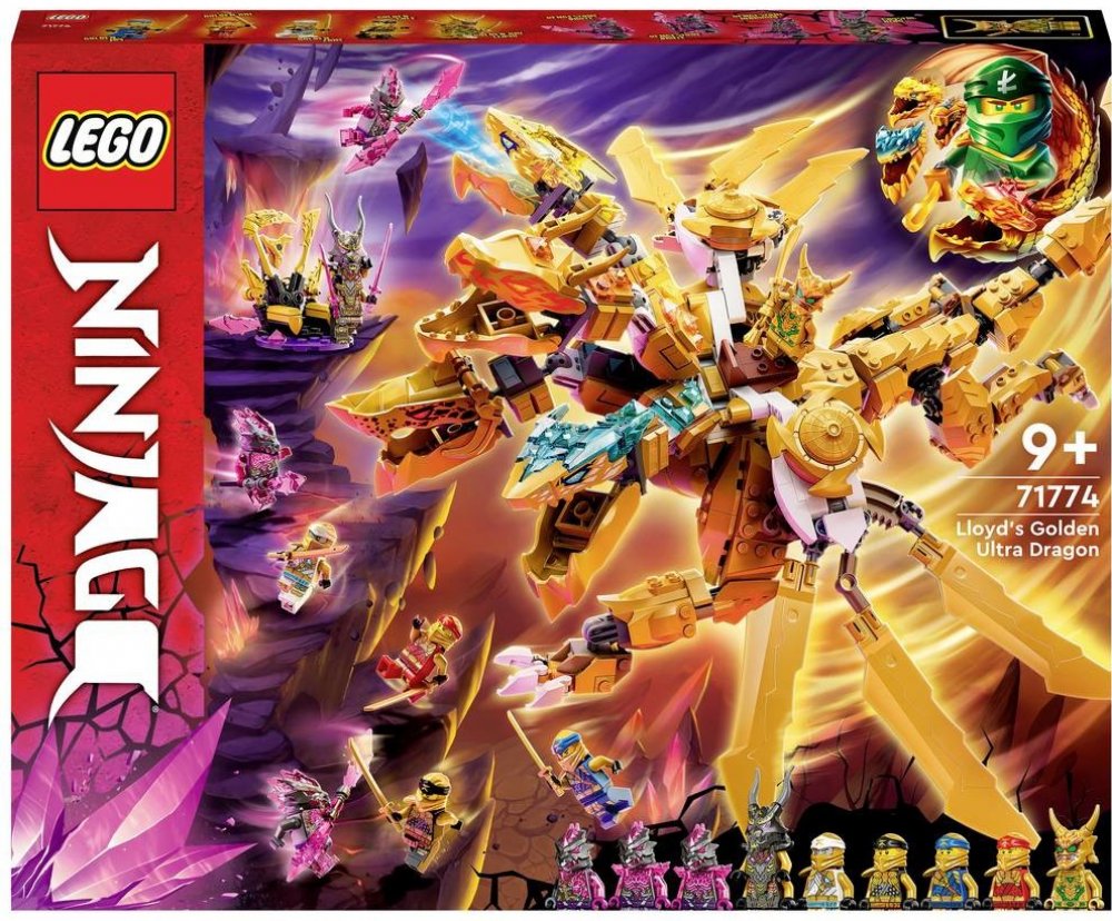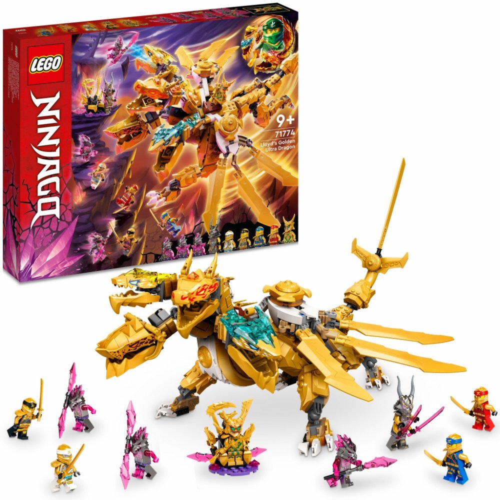 Se stavebnicí Lloydův zlatý ultra drak (71774) si mohou děti od 9 let přehrávat oblíbené scény ze seriálu NINJAGO®: Crystallized. Model potěší dosud největším drakem NINJAGO se 4 hlavami, vysoce pohyblivýma nohama a ocasem a párem křídel, která lze rozložit a získat tak 3 čepele – samozřejmě ze zlata!