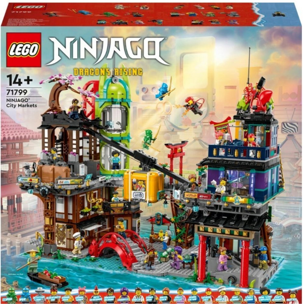 LEGO® stavebnice LEGO® Ninjago® 71799 Trhy v NINJAGO® City přináší monumentální stavitelský zážitek s více než 6 000 dílky. Sada obsahuje čtyřpatrový městský blok plný trhů, obchodů, bytu, restaurací a dalších prostor, které dohromady vytvářejí dynamické městské prostředí. Díky mnoha realistickým prvkům, jako je výtah, lanovka, rybí trh, karaoke klub nebo d...
