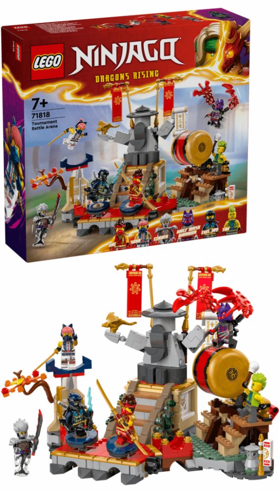 S propracovanou stavebnicí Turnajová bitevní aréna si kluci a holky od 7 let připomenou dramatický závěrečný souboj z 2. řady televizního seriálu NINJAGO Dračí povstání. Stavebnice s nindžovskou bitvou obsahuje spoustu interaktivních funkcí, které dětem zaručí hodiny hraní, a až hra skončí, bude se skvěle vyjímat na polici nebo na nočním stolku.Tato stavebnice LEGO NINJAGO obsahuje 2 pohyblivé plošiny, se kterými si děti mohou přehrávat napínavé bitvy s nindžou a padouchem, velký buben, který mohou odsunout ze stojanu a dokutálet ho do arény, a schodiště, které se po zatažení za páku složí, takže všechny postavy na něm sklouznou dolů. Tato sestavitelná nindžovská stavebnice pro děti obsahuje 6 minifigurek NINJAGO. Nindžové Kaia Sora v turnajovém brnění a se zbrusu novými krátkými katanami bojují proti řadě padouchů: Cinderovi, válečníkovi s vlčí maskou a proti zlému Jayovi a Tox, kteří jsou exkluzivní součástí této stavebnice.