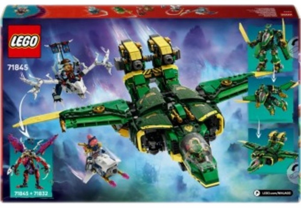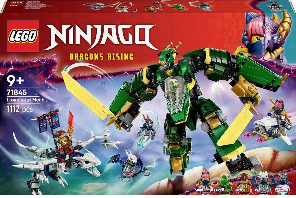 Děti od 9 let si se stavebnicí Lloydův robotický tryskáč (71845) užijí nindžovská dobrodružství, bitvy ve vzduchu i na zemi a připomenou si akční scény ze 3. řady televizního seriálu NINJAGO® Dračí povstání. Děti si s užijí akční hraní s touto působivou bitevní stavebnicí robota, který má pohyblivé nohy a ruce, kokpit a 2 velké meče. Poté můžou přeskládat jeho robotické části na parádní model tryskáče s kokpitem, křídly a tryskovými motory. Tato dobrodružná bitevní stavebnice obsahuje 5 minifigurek: Soru a Lloyda vyzbrojené nindžovskými zbraněmi, aby se mohli postavit zlotřilé Kur, Tyrovi a Přízračnému dračímu bojovníkovi, kteří mají prapor s tajnou zprávou, kterou lze přečíst pouze pomocí Lloydovy průsvitné odhalující čepele. Sora má k dispozici létající motorku a padouši mají pohyblivého přízračného draka, kterého lze kombinovat s dílky ze stavebnice Drak chaosu Thunderfang (71832) (prodává se samostatně). Stavebnice se skládá z 1112 dílků.