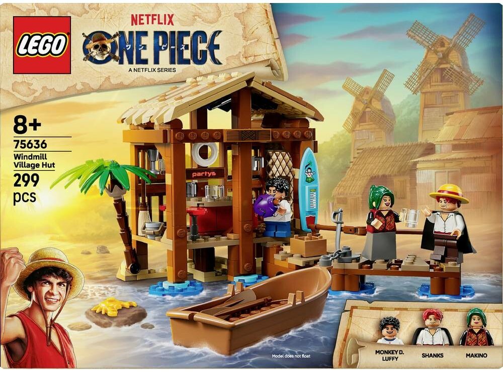 Děti sundají střechu obchodu na pláži a nahlédnou do interiéru plného zábavných detailů. Uvnitř najdou příslušenství pro chod prodejny a zabavení zákazníků. Na zdi visí plakát s hledanou osobou a místo na další plakáty, které najdete v dalších stavebnicích LEGO® ONE PIECE (prodávají se samostatně). Venku najdete pirátskou loď přivázanou k molu. Stavebnice obsahuje minifigurky Luffyho, Shankse a Makino, 3 nezapomenutelných postav ze seriálu od Netflixu. Pro ještě větší porci digitální zábavy stavitelé můžou přibližovat a otáčet modely ve 3D a sledovat postup stavění pomocí intuitivní aplikace LEGO Builder. Stavebnice obsahuje 299 dílků.
