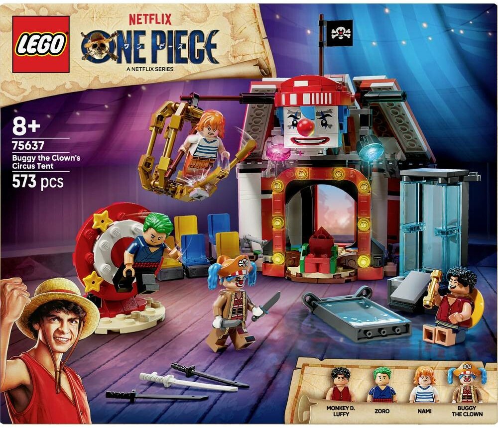 Součástí stavebnice jsou minifigurky Luffyho, Zora, Nami a pirátského kapitána Klauna Buggyho. Sestavitelný stan lze otočit a vytvořit tak větší hrací plochu s odnímatelnými částmi s židlemi a Buggyho trůnem. Součástí jsou také 3 cirkusové pasti, ze kterých musí hrdinové uniknout: nádrž na vodu, otáčející se terč a závěsná klec. Uvnitř stanu najdete krabice a sudy s dílky, ze kterých lze postavit menší verzi Buggyho. Nechybí spousta skvělých zbraní a doplňků, včetně 2 plakátů hledaných osob. Pro ještě větší porci digitální zábavy můžou stavitelé přibližovat a otáčet modely ve 3D a sledovat postup stavění pomocí intuitivní aplikace LEGO Builder. Stavebnice obsahuje 573 dílků.
