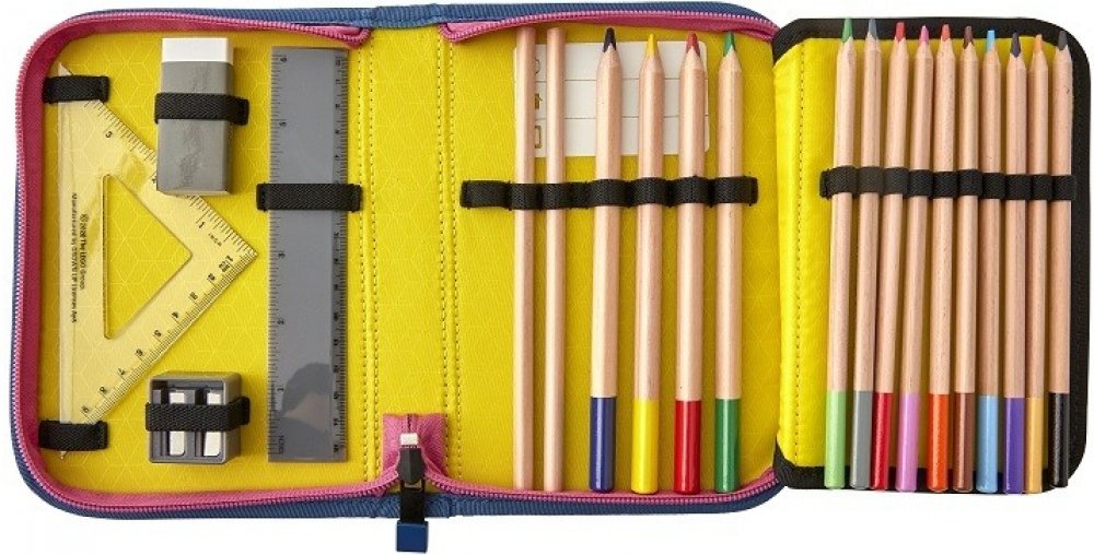Náplň: 2 tužky, 10 pastelek, 4 široké pastelky, guma na gumování, ořezávátko, 2 pravítka