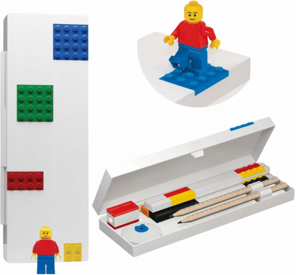 Neobyčejné LEGO pouzdro na LEGO tužky, pera, gumy, ořezávátka. Součástí plastového boxu je LEGO podložka, na kterou můžete snadno přicvaknout další LEGO školní nebo kancelářské potřeby.