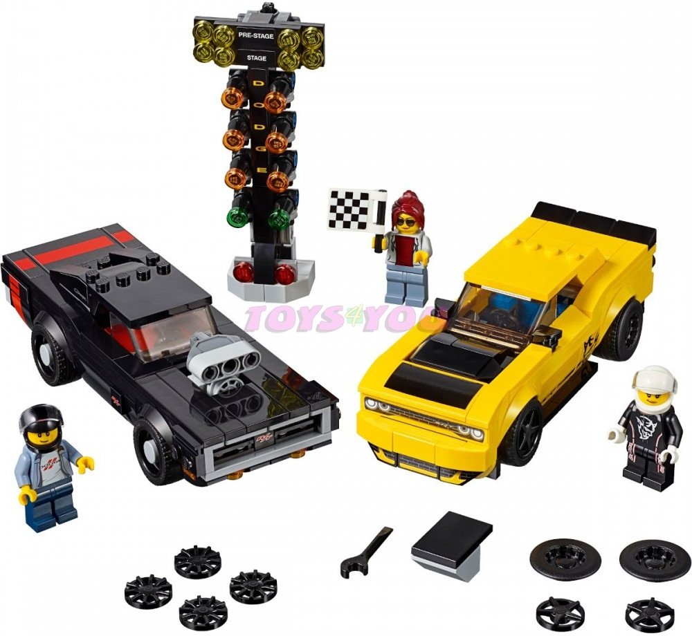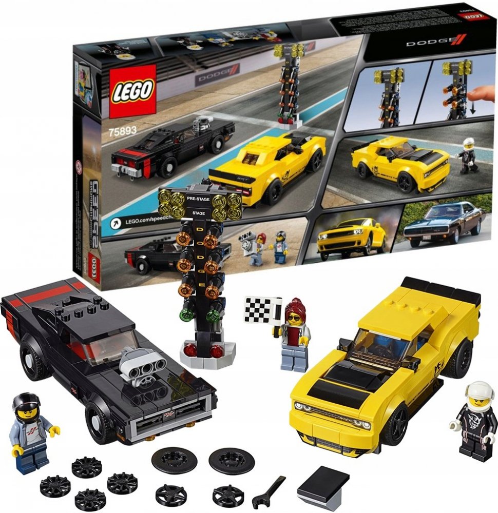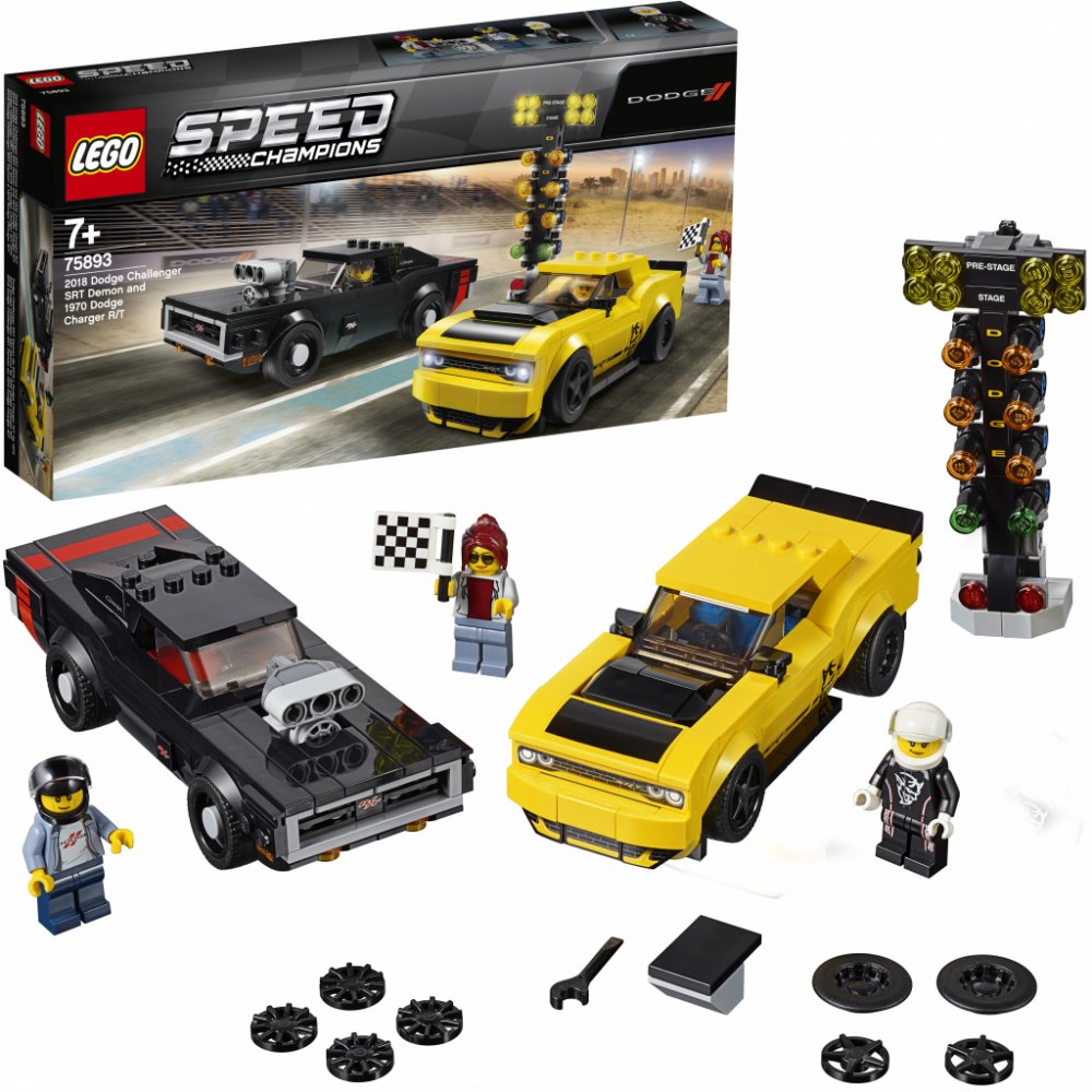 Užij si vzrušující stavění a zážitek ze závodění pro děti i dospělé s touto parádní stavebnicí LEGO® Speed Champions 75893 2018 Dodge Challenger SRT Demon a 1970 Dodge Charger R/T! Dodge Challenger je vybaven 2 sadami ráfků, autentickými detaily a dekorativními samolepkami, zatímco skvělá LEGO verze kultovního amerického vozidla Dodge Charger má vyměnitelný kompresor a alternativní kryt motoru. Odstartuj závod pomocí startovacího světla v podobě vánočního stromku. V sadě také najdeš traťového komisaře s cílovou vlajkou a 2 minifigurky jezdců.