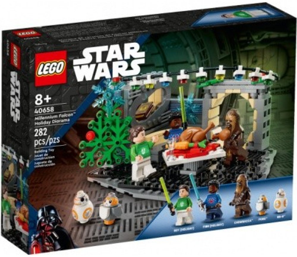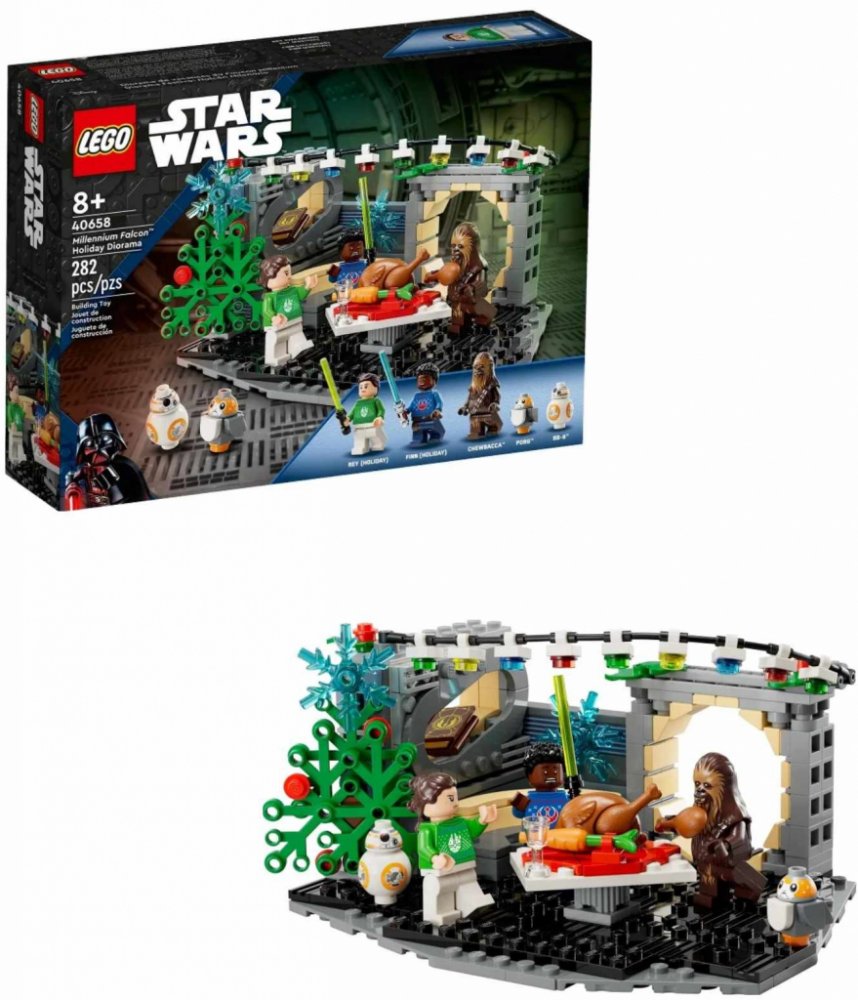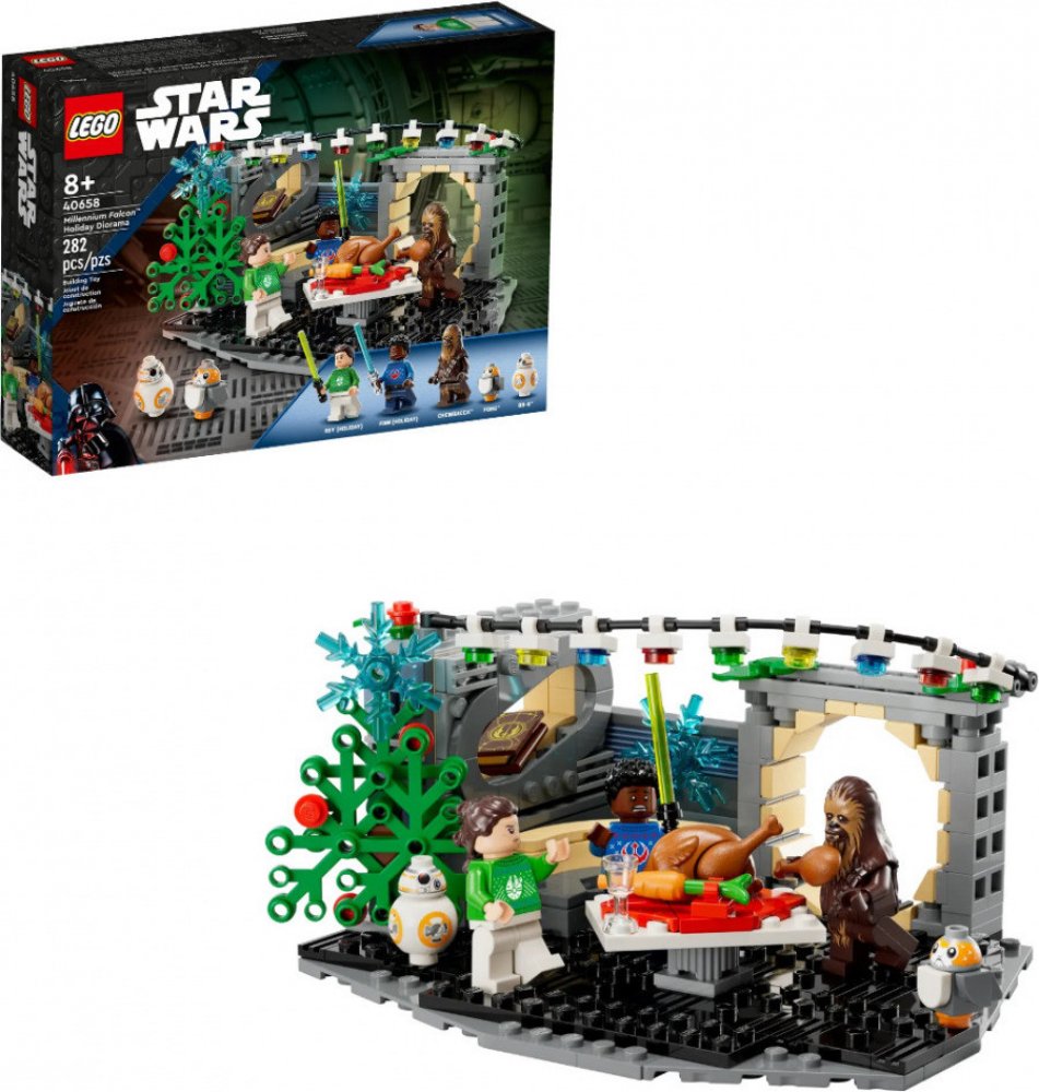 Malí fanoušci si připomenou vánoční scénu z filmu LEGO® Star Wars: Sváteční speciál se sadou Millennium Falcon™ – Vánoční diorama. Tato stavebnice je skvělým tipem na dárek pro děti od 8 let a najdete v ní nezapomenutelný salonek z kostek a místnost na spaní v kultovním Millennium Falconu. Vánoční atmosféru doplňuje sestavitelný vánoční stromek, barevná vánoční světýlka, jmelí a talíř s krocanem a mrkví. Stavějte, hrajte si a kombinujte Scéně vdechuje život 5 postav LEGO Star Wars™, včetně minifigurek LEGO Rey a Finna ve vánočních svetrech, které vyjdou v říjnu 2023, a také doplňky jako je Reyina kniha Jediů. Pro ještě více možností tvoření můžete stavebnici spojit s modely a postavami ze sady Adventní kalendář LEGO Star Wars 2023 (75366). Časově omezená dostupnost Upozorňujeme, že tato žádaná stavebnice z řady LEGO Star Wars je dostupná pouze od 1. října do 31. prosince 2023.