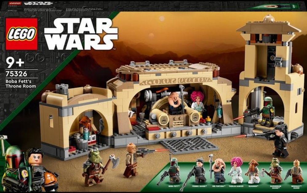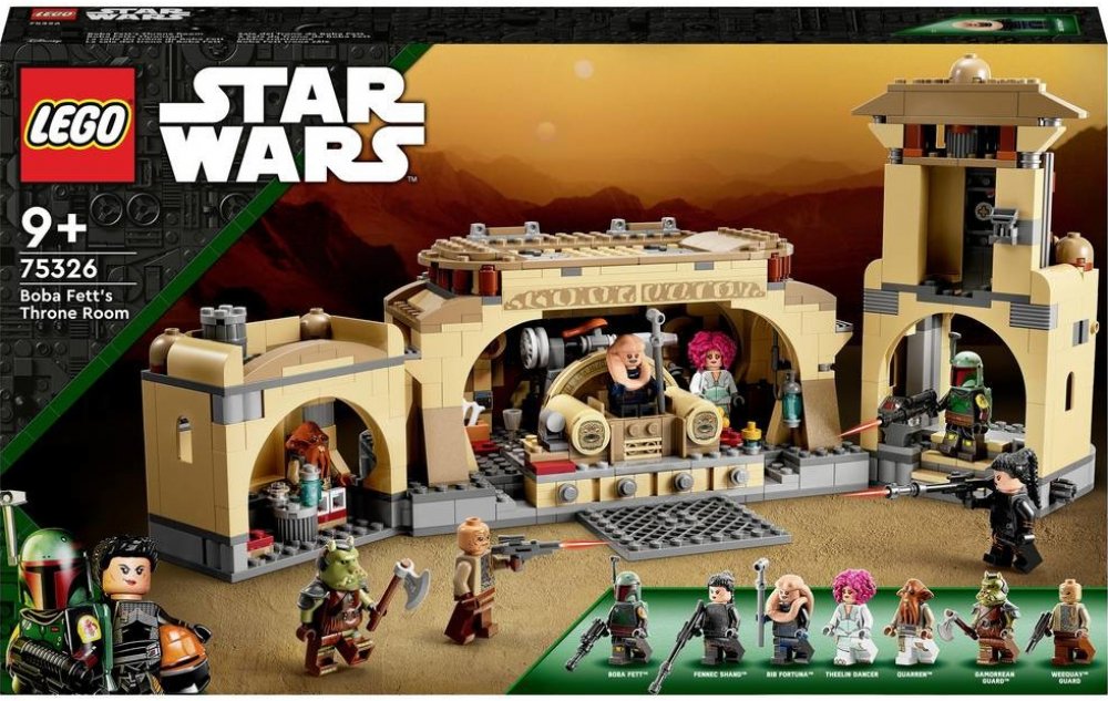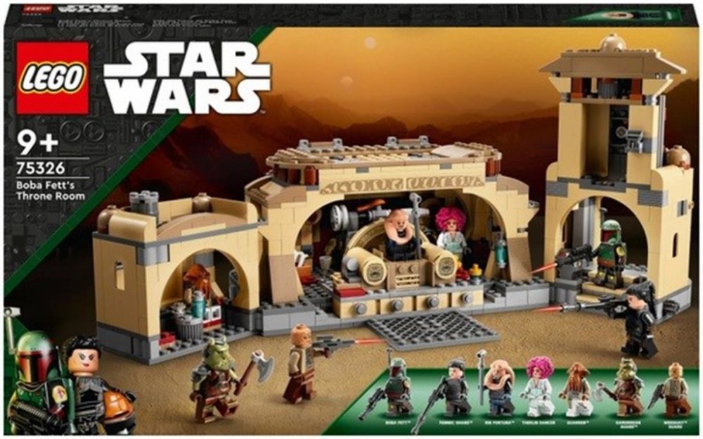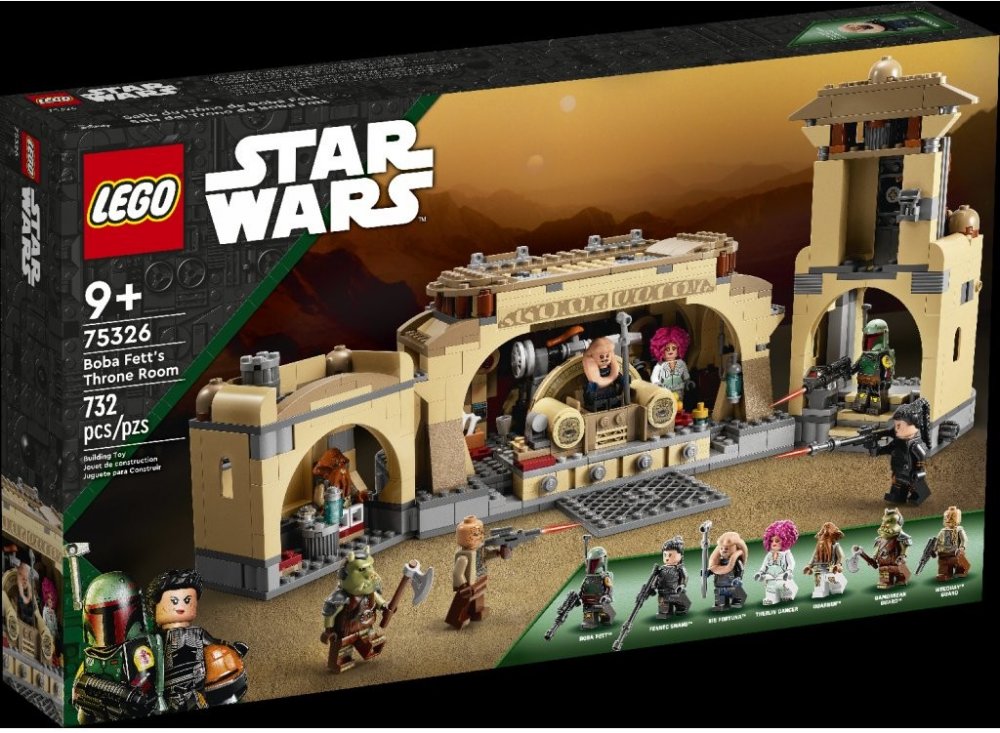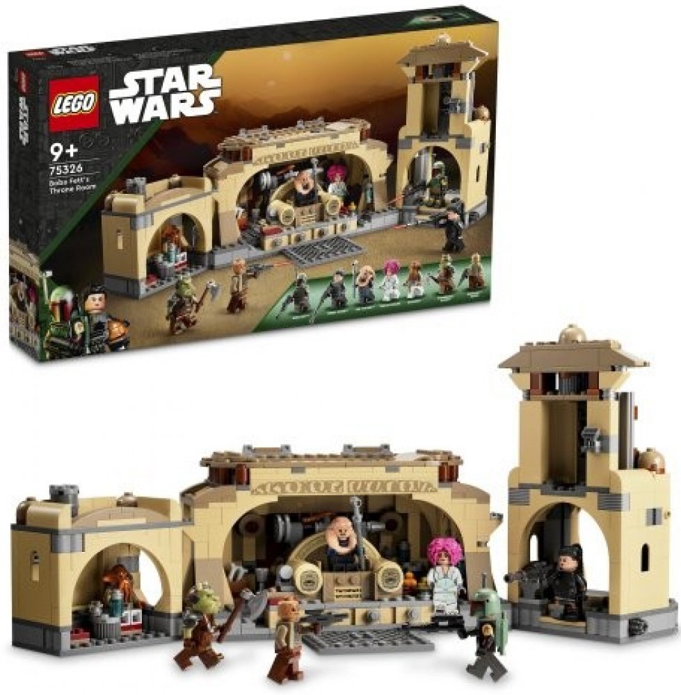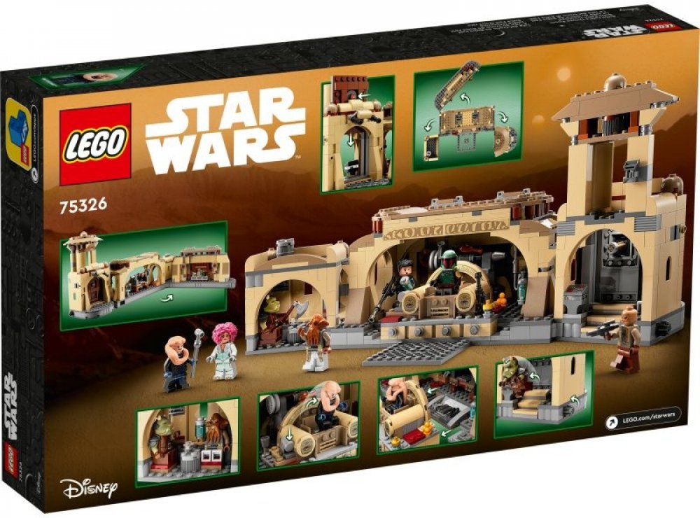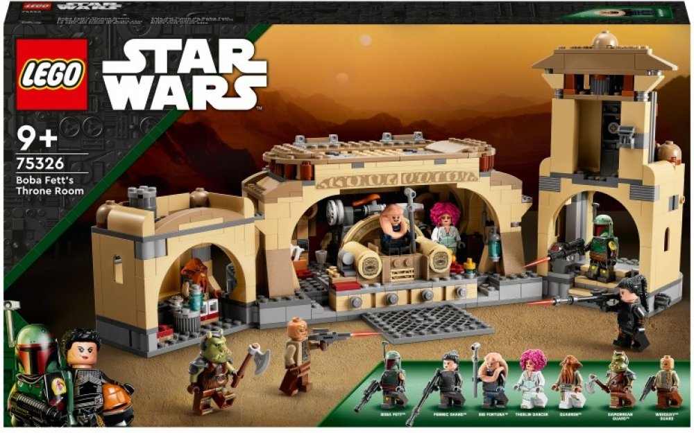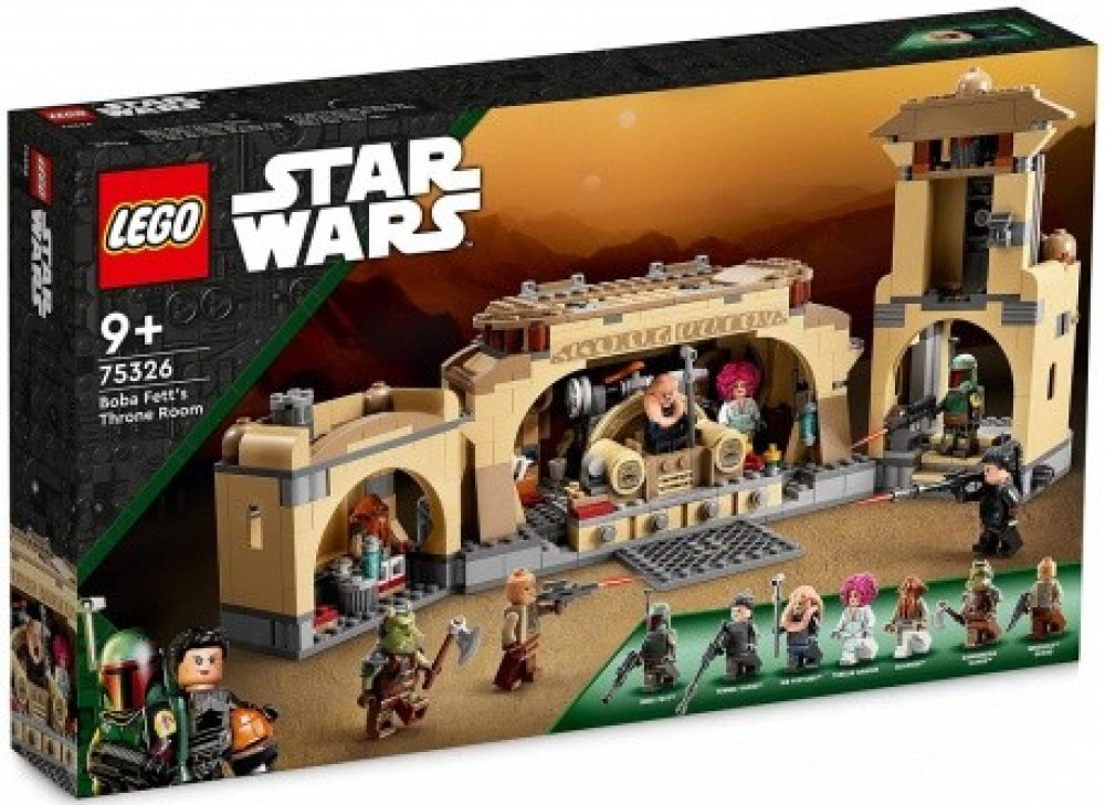- Trůnní sál Boby Fetta – Fanoušci seriálu Star Wars: The Book of Boba Fett si mohou díky této sadě (75326) od LEGO® Star Wars™ připomenout autentické detaily trůnního sálu a ostatních částí Jabba Huttova paláce