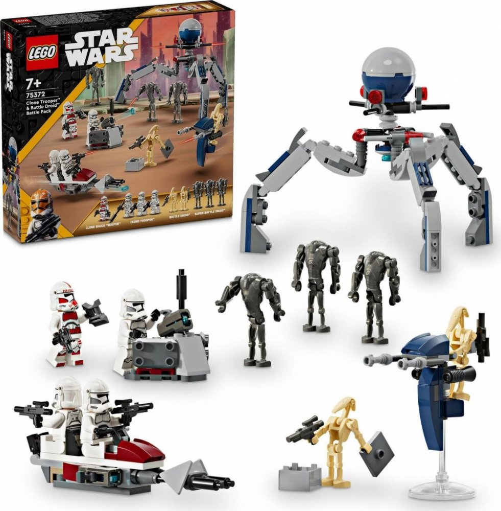 - Bitevní balíček klonovaného vojáka a bitevního droida pro děti – Připomeňte si scény ze seriálu Star Wars: Klonové války a přetvořte je do podoby z kostek LEGO® s figurkami LEGO, spídrovou motorkou a spoustou dalšího