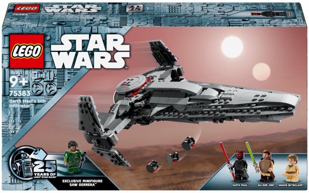 Postavte Infiltrátor Sithů Dartha Maula a prožijte nezapomenutelné chvíle díky této stavebnici inspirované scénou z filmu Star Wars: Skrytá hrozba. Tento set určený pro děti od devíti let je ideálním dárkem pro fanoušky a sběratele modelů z Star Wars. Vlastnosti produktu:Autentický design: Detailně propracovaný osobní loď Dartha Maula vyrobený z LEGO kostek s mnoha zajímavými funkcemi, které inspirují k akčním mezihvězdným dobrodružstvím. Čtyři minifigurky LEGO: Darth Maul, Anakin Skywalker, Qui-Gon Jinn a exkluzivní minifigurka Saw Gerrery k 25. výročí LEGO Star Wars, včetně stojanu pro vystavení. Zábava při stavění: Roztahovatelná křídla, zatahovací podvozek, dvě pružinová děla a poklop umožňují uvolnit tři průzkumné droidy DRK-1 z přední části. Kreativní hraní: Darth Maul může usednout na svůj spídrový stroj uvnitř kokpitu jedinečné lodi, doplněný o svůj ikonický dvojitý světelný meč a světelný meč Qui-Gona Jinna. Interaktivní aplikace: V aplikaci LEGO Builder mohou děti přibližovat, otáčet a zachytávat digitální verzi modelu. Rozměry modelu: Model měří 7 cm na výšku, 27 cm na délku a 20 cm na šířku a celá stavebnice obsahuje 640 dílků. Tato stavebnice LEGO Star Wars přináší radost dětem i dospělým fanouškům, umožňuje jim přehrávat ikonické scény nebo tvořit vlastní příběhy.