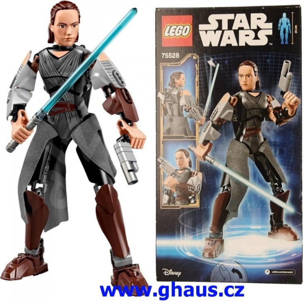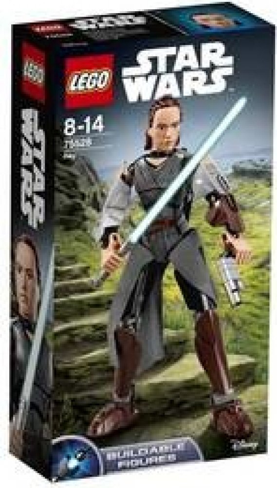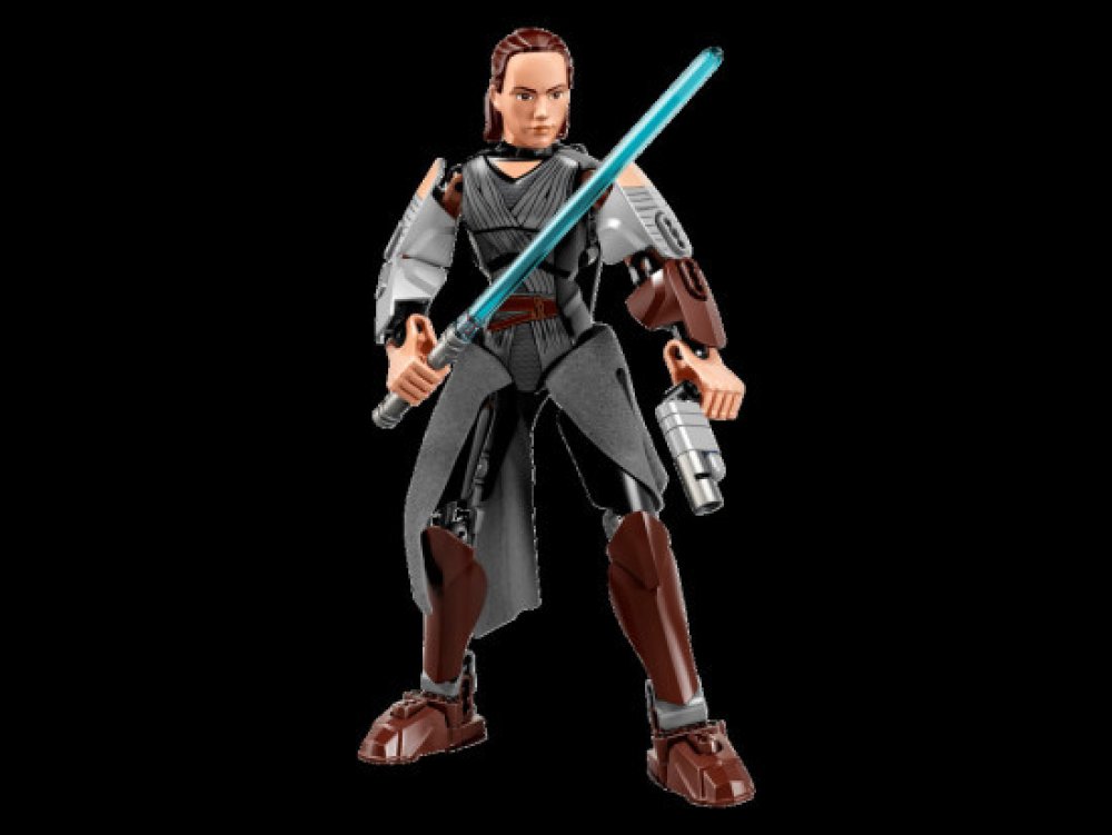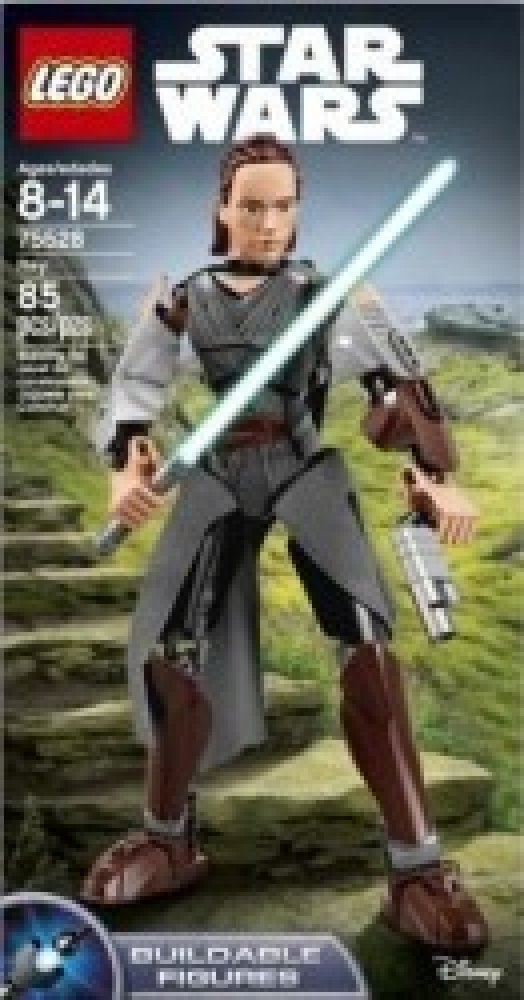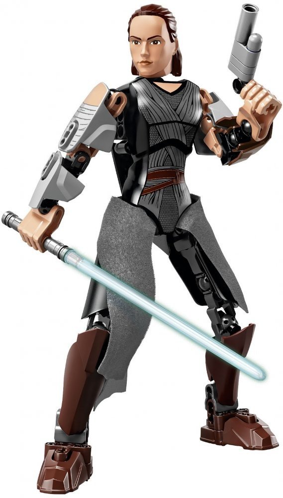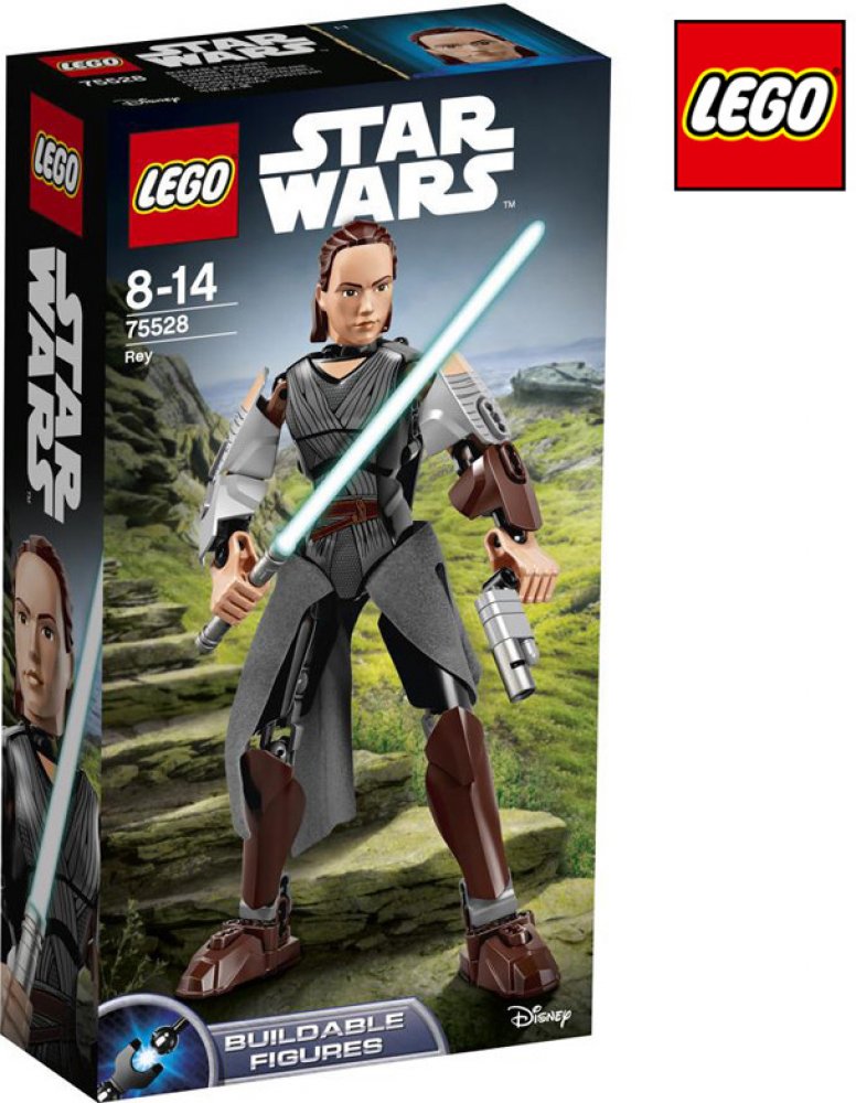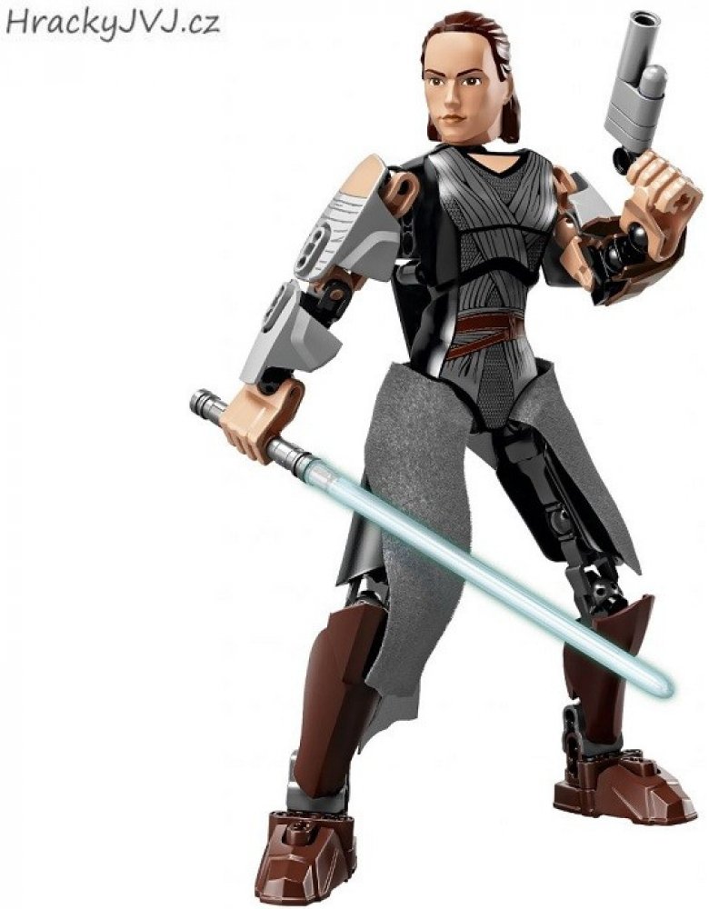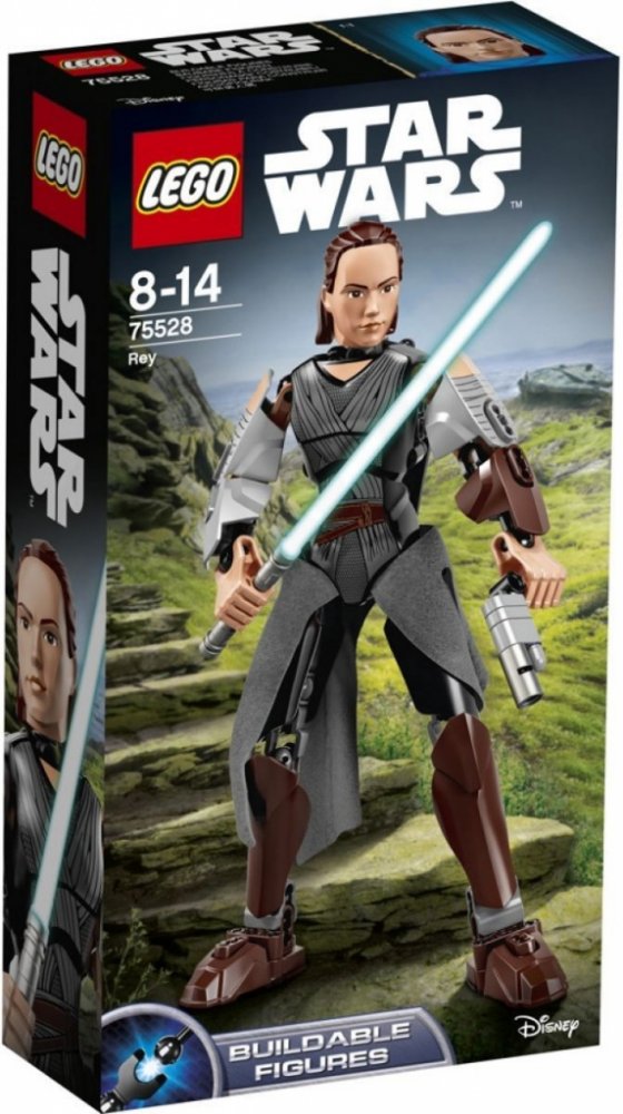 - Sestavitelná a vysoce pohyblivá figurka Rey obsahuje látkové detaily, dekoraci hrudi a ramen, design hlavy, který je novinkou pro září 2017, modrý světelný meč, blasterovou pistoli a bojovou funkci máchání paže, ovládanou otáčením kolečka.