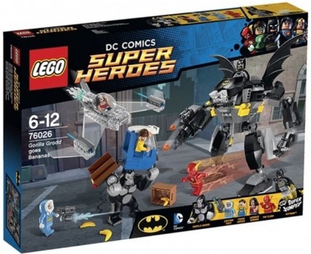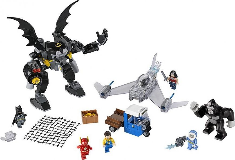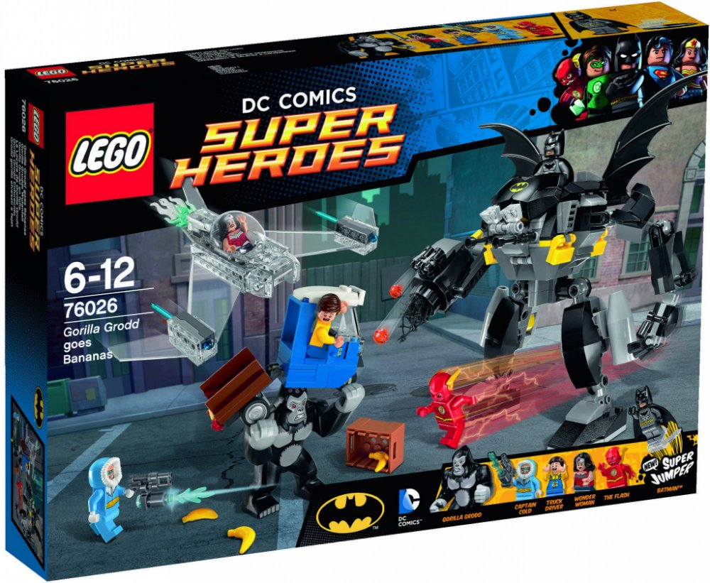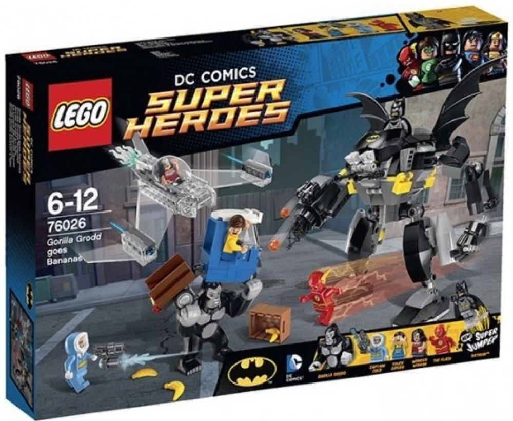 Gorila Grodd páchá hroznou spoušt v Gothamu. Když se snaží dostat svou ranní dávku banánů! Obrovská gorila skáče po nákladním autu, bedny s banány létají všemi směry a automobil se pod vahou gorily skoro rozlomí v půlce. Pospíchej, abys s Batmanem zachránil vystrašeného řidiče, na pomoc máš úžasného Batrobota. Odpověz protiútokem se třemi Super hrdiny LEGO, vystřel sít a náboje ze zbraní. Postav se spolu s Flashem proti silácké gorile Groddovi, vyhýbej se jejím spárům, a Kapitánu Coldovi s jeho ničivou ledovou zbraní. Přidej se nepozorovaně do boje s Wonder Woman v jejím neviditelném tryskáči s pružinovými raketami, poté pošli Batmana, který skočí z robota za pomoci super skokánku, aby gorilu Grodd přemohl! Obsahuje 4 minifigurky s různými zbraněmi a doplnky: Flash, Wonder Woman, Batman a Kapitán Cold, navíc figurka gorily Grodd.