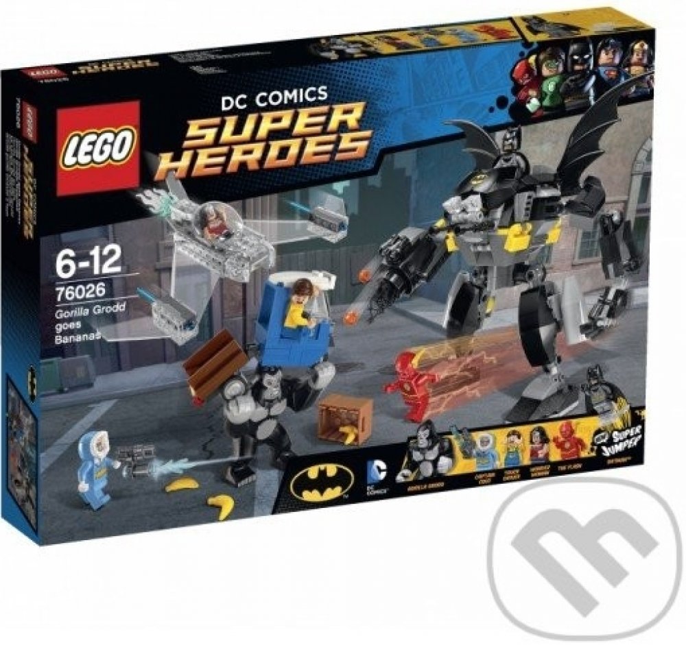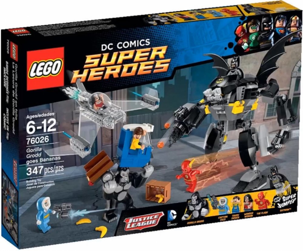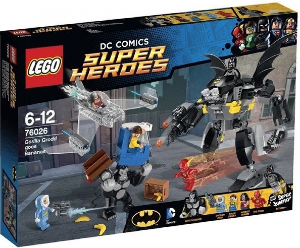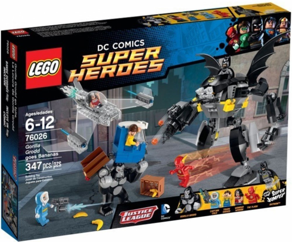 Gorila Grodd páchá hroznou spoušt v Gothamu. Když se snaží dostat svou ranní dávku banánů! Obrovská gorila skáče po nákladním autu, bedny s banány létají všemi směry a automobil se pod vahou gorily skoro rozlomí v půlce. Pospíchej, abys s Batmanem zachránil vystrašeného řidiče, na pomoc máš úžasného Batrobota. Odpověz protiútokem se třemi Super hrdiny LEGO, vystřel sít a náboje ze zbraní. Postav se spolu s Flashem proti silácké gorile Groddovi, vyhýbej se jejím spárům, a Kapitánu Coldovi s jeho ničivou ledovou zbraní. Přidej se nepozorovaně do boje s Wonder Woman v jejím neviditelném tryskáči s pružinovými raketami, poté pošli Batmana, který skočí z robota za pomoci super skokánku, aby gorilu Grodd přemohl! Obsahuje 4 minifigurky s různými zbraněmi a doplnky: Flash, Wonder Woman, Batman a Kapitán Cold, navíc figurka gorily Grodd.